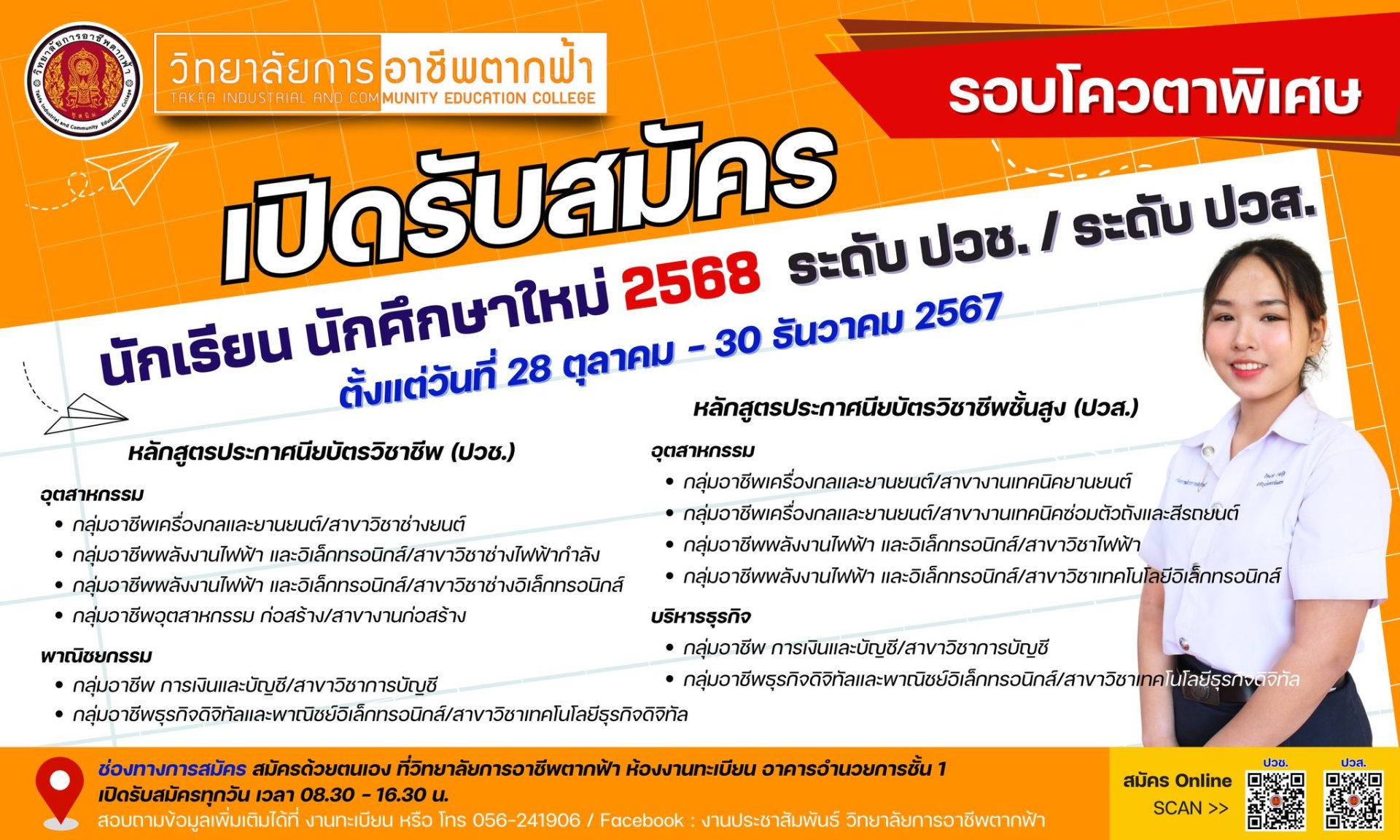 โควตามาแล้วววววว วิทยาลัยการอาชีพตากฟ้า เปิดรับนักเรียน นักศึกษาใหม่ ประจำปีการศึกษา 2568 ระดับ ปวช.และ ปวส. ตั้งแต่วันที่ 28 ตุลาคม 2567 - 30 ธันวาคม 2567 ช่องทางการสมัคร สมัครด้วยตนเอง ที่วิทยาลัยการอาชีพตากฟ้า ห้องงานทะเบียน อาคารอำนวยการชั้น 1 #เ