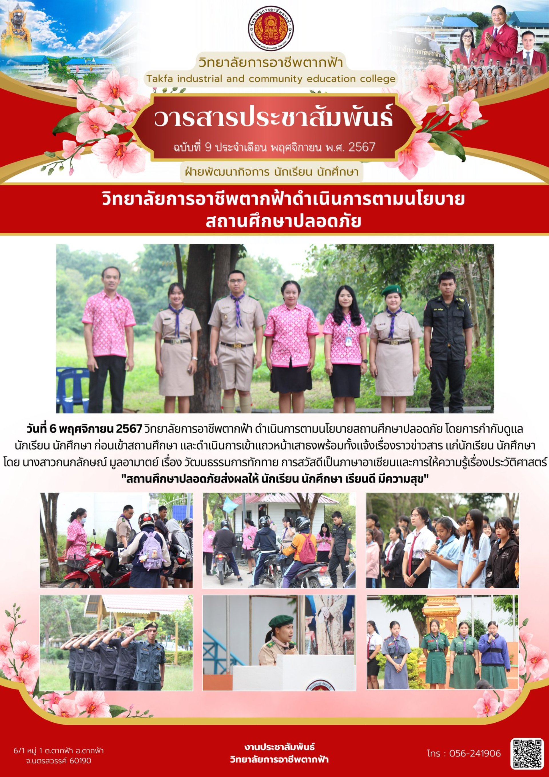 วารสารตากฟ้า ประจำเดือน พฤศจิกายน 2567 ฉบับที่ 9 วิทยาลัยการอาชีพตากฟ้าดำเนินการตามนโยบายสถานศึกษาปลอดภัย