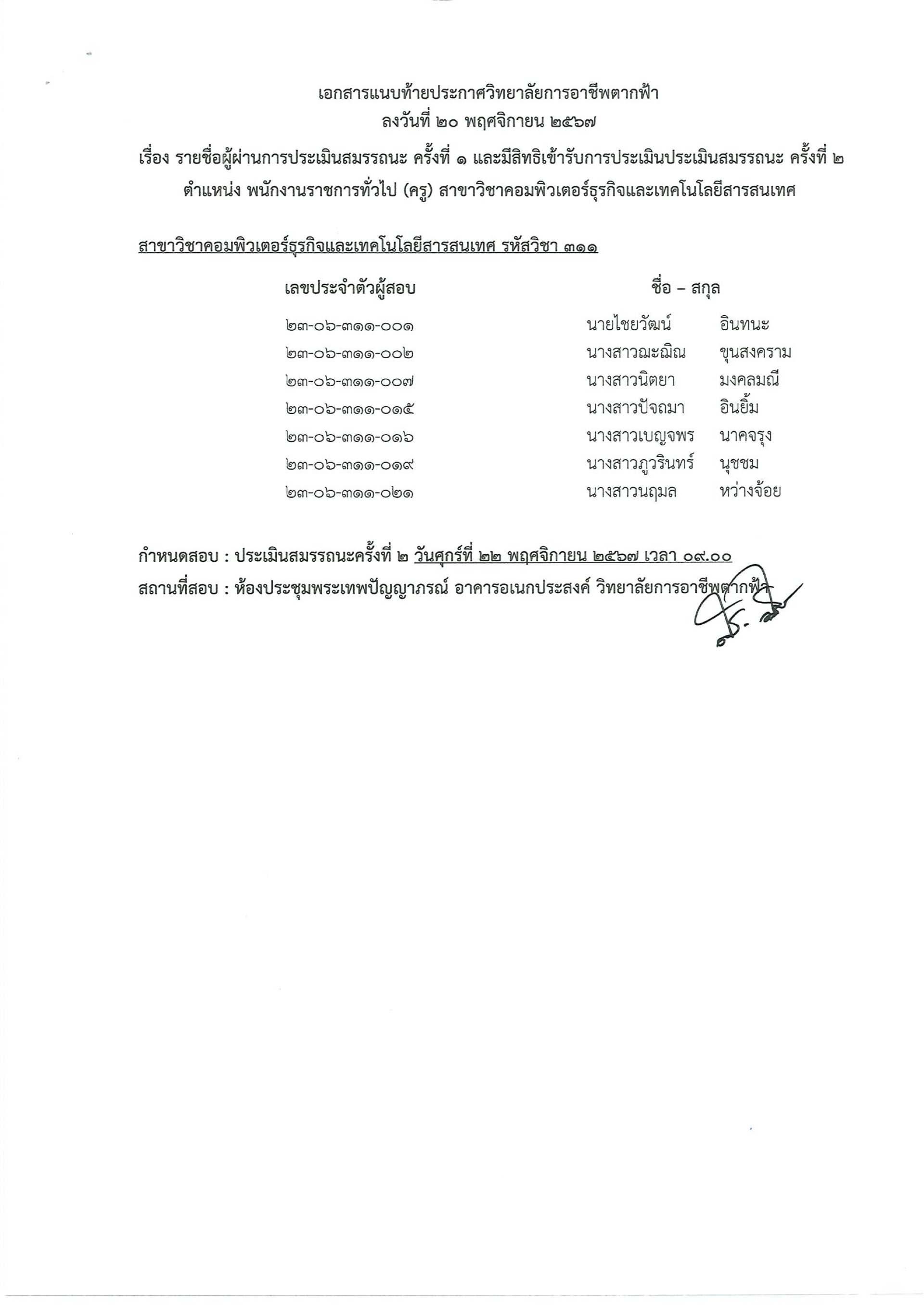 ประกาศวิทยาลัยการอาชีพตากฟ้า เรื่อง รายชื่อผู้ผ่านการประเมินสมรรถนะครั้งที่ 1 และมีสิทธิ์เข้ารับการประเมินสมรรถนะครั้งที่ 2 ตำแหน่งพนักงานราชการทั้วไป (ครู) สาขาวิชาคอมพิวเตอร์ธุรกิจและเทคโนโลยีสารสนเทศ รหัสวิชา 311