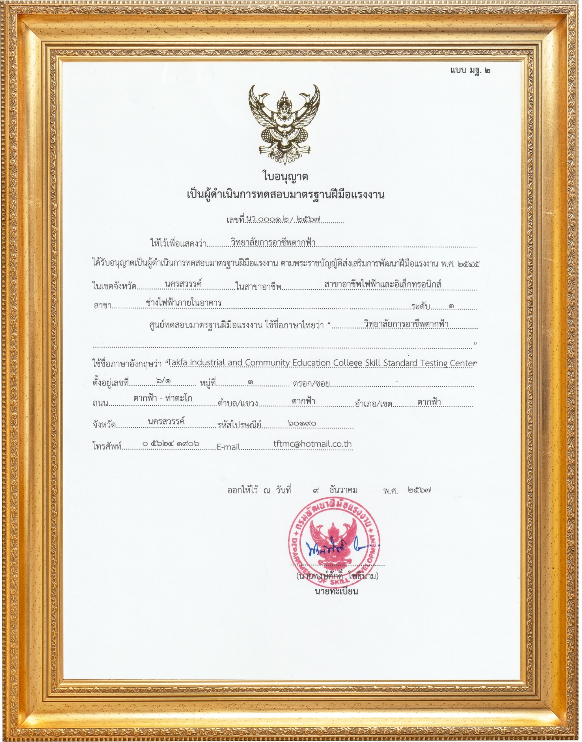 เรื่อง วิทยาลัยการอาชีพตากฟ้า ได้รับอนุญาตเป็นผู้ดำเนินการทดสอบฝีมือแรงงาน ตามพระราชบัญญัติส่งเสริมการพัฒนาฝีมือแรงงาน พ.ศ.2545