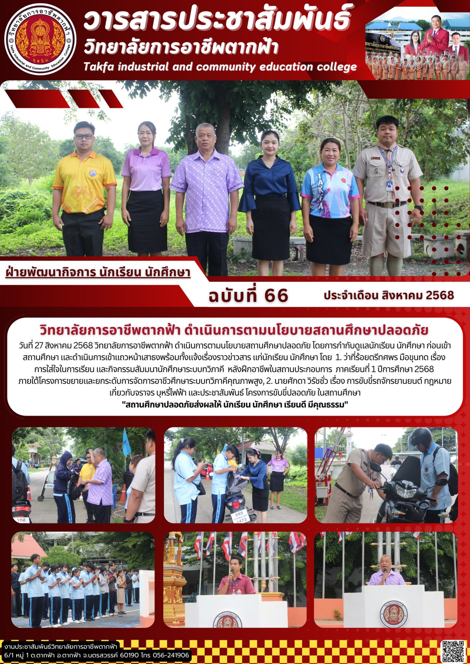 วารสารตากฟ้า ประจำเดือน สิงหาคม 2568 ฉบับที่ 66 วิทยาลัยการอาชีพตากฟ้า ดำเนินการตามนโยบายสถานศึกษาปลอดภัย