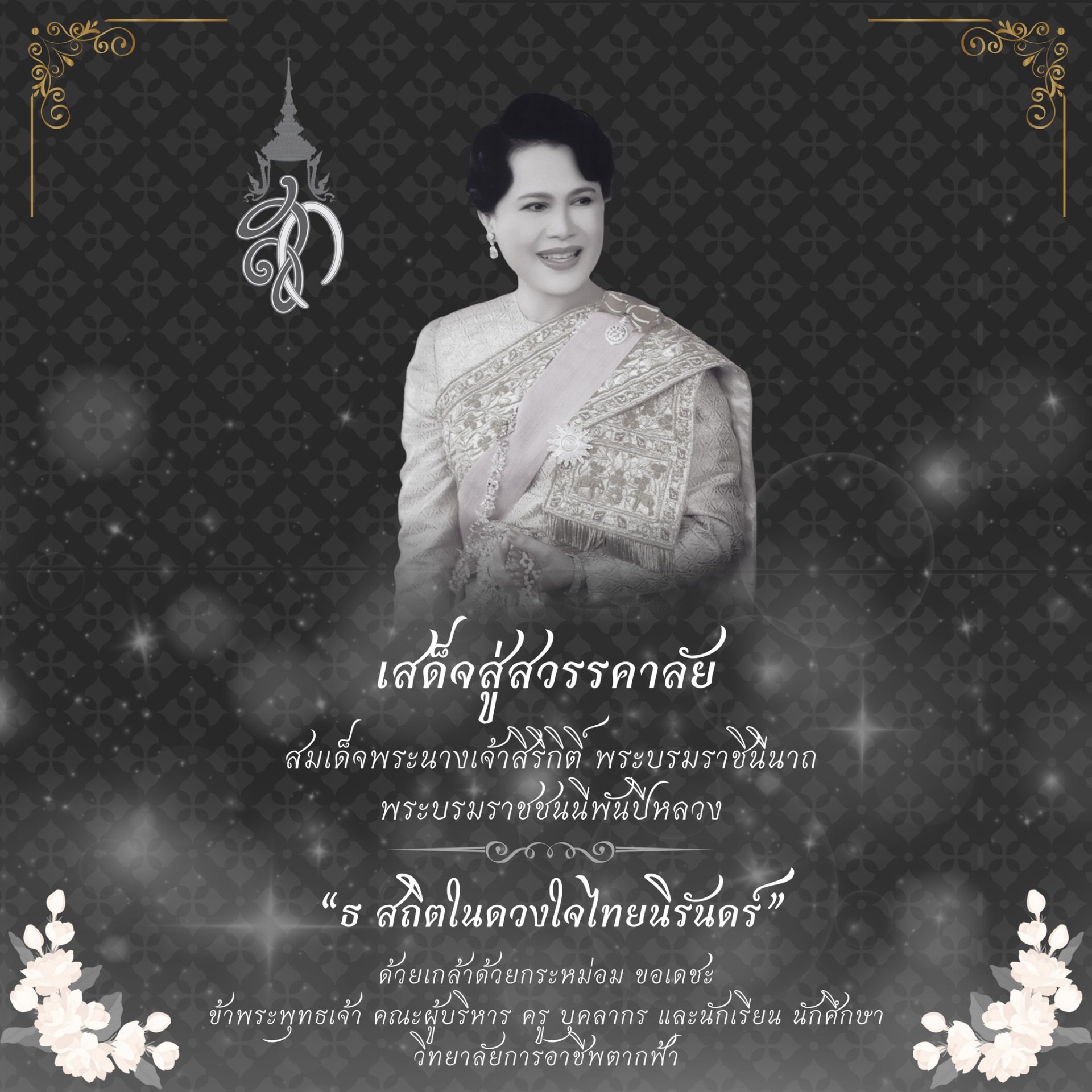เสด็จสู่สวรรคาลัย สมเด็จพระนางเจ้าสิริกิติ์ พระบรมราชินีนาถ พระบรมราชชนนีพันปีหลวง “ธ สถิตในดวงใจไทยนิรันดร์” ด้วยเกล้าด้วยกระหม่อม ขอเดชะ ข้าพระพุทธเจ้า คณะผู้บริหาร ครู บุคลากร และนักเรียน นักศึกษา วิทยาลัยการอาชีพตากฟ้า