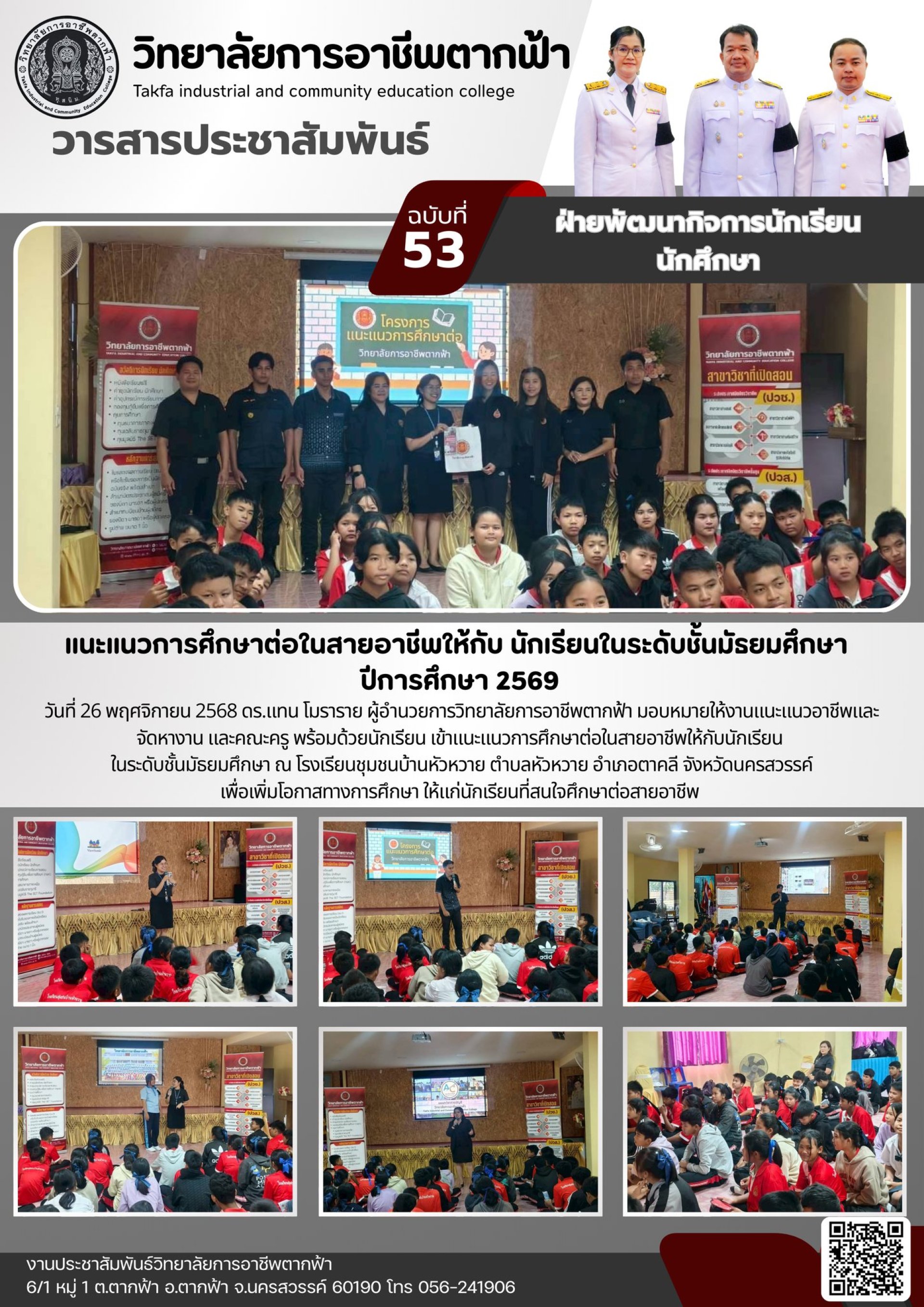 วารสารตากฟ้า ประจำเดือน พฤศจิกายน 2568 ฉบับที่ 53 แนะแนวการศึกษาต่อในสายอาชีพให้กับ นักเรียนในระดับชั้นมัธยมศึกษา ปีการศึกษา 2569