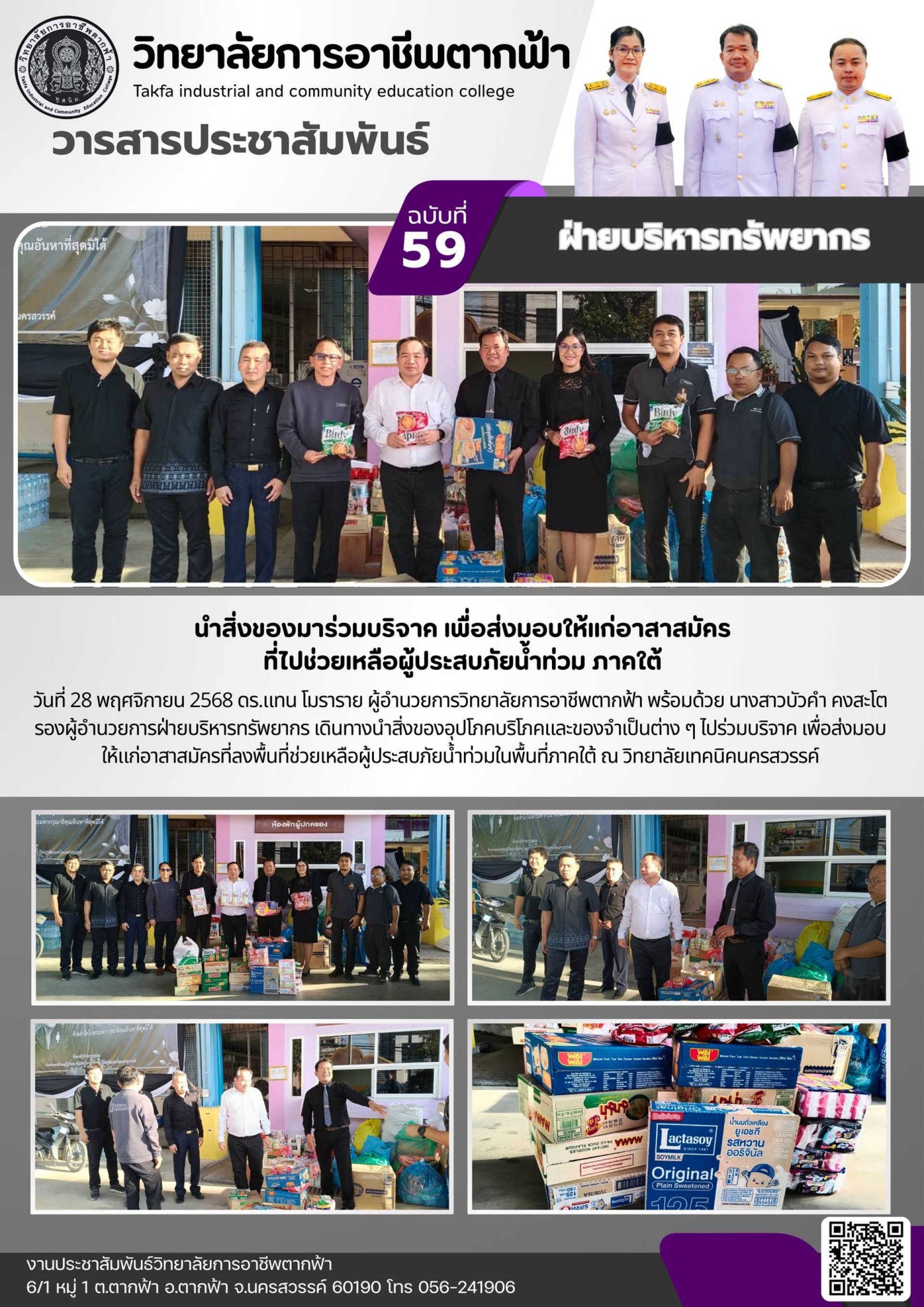 วารสารตากฟ้า ประจำเดือน พฤศจิกายน 2568 ฉบับที่ 59 นำสิ่งของมาร่วมบริจาค เพื่อส่งมอบให้แก่อาสาสมัครที่ไปช่วยเหลือผู้ประสบภัยน้ำท่วม ภาคใต้