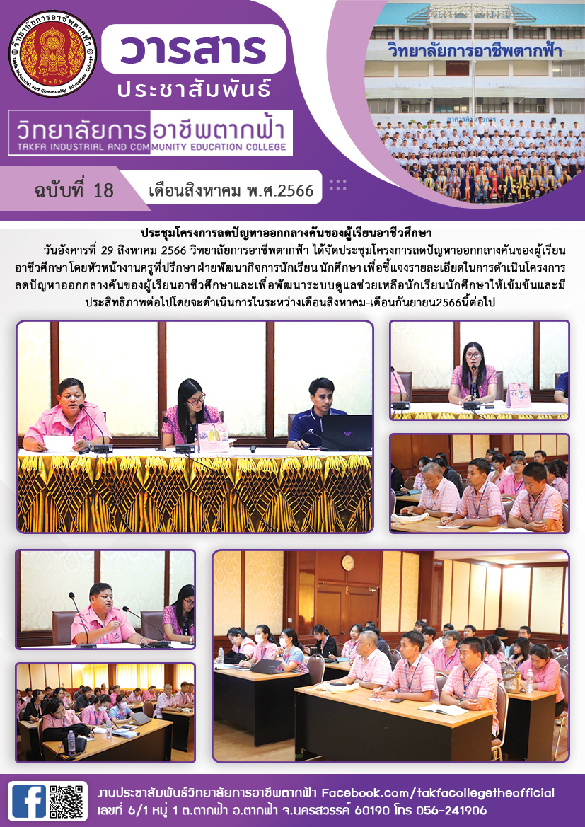 วารสารตากฟ้า ฉบับที่ 18 ประชุมโครงการลดปัญหาออกกลางคันของผู้เรียนอาชีวศึกษาวันอังคารที่ 29 สิงหาคม 2566