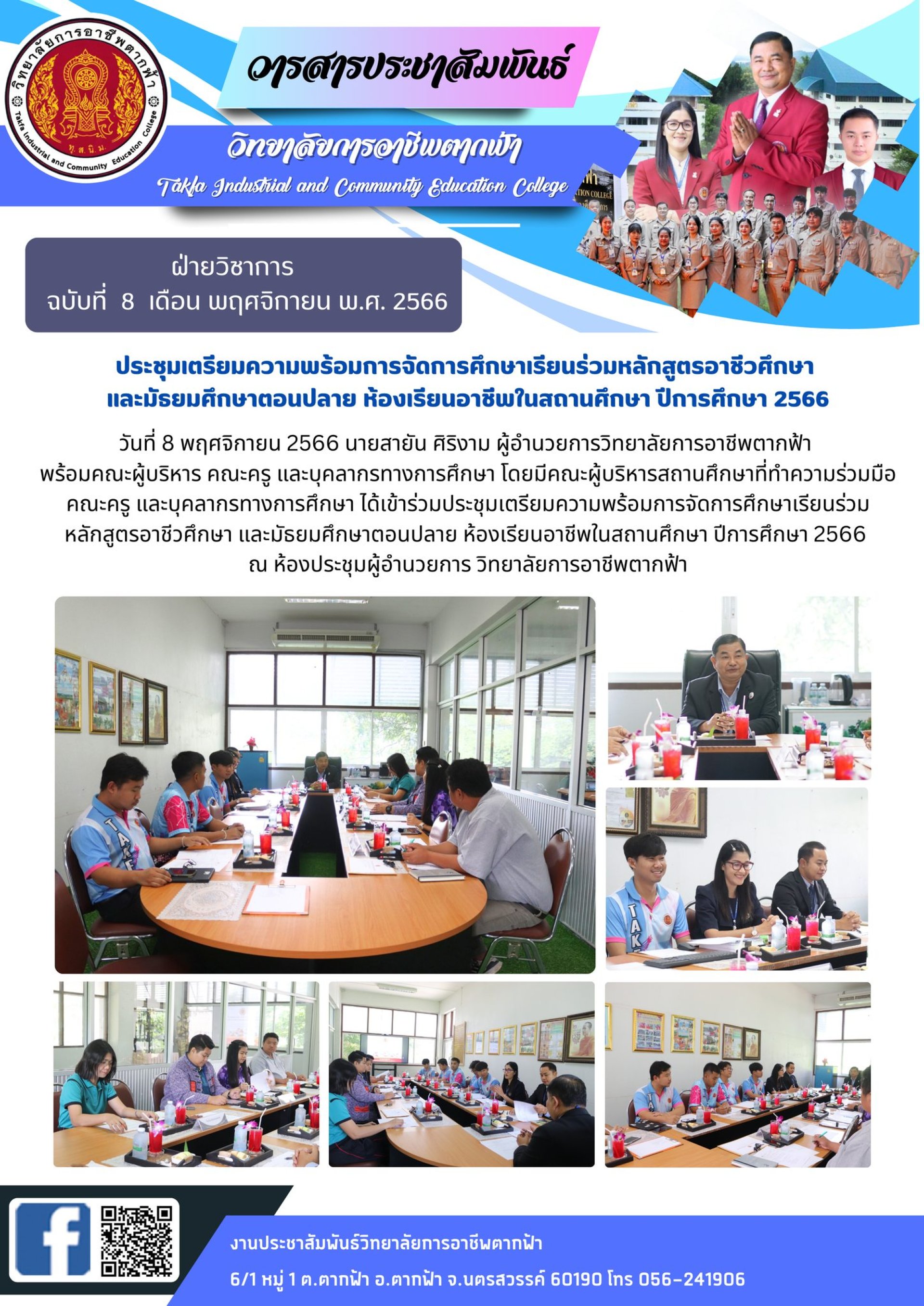 วารสารตากฟ้าประจำเดือนพฤศจิกายน 2566 ฉบับที่ 8 ประชุมเตรียมความพร้อมการจัดการศึกษาเรียนร่วมหลักสูตรอาชีวศึกษา และมัธยมศึกษาตอนปลาย ห้องเรียนอาชีพในสถานศึกษา ปีการศึกษา 2566 วันที่ 8 พฤศจิกายน 2566
