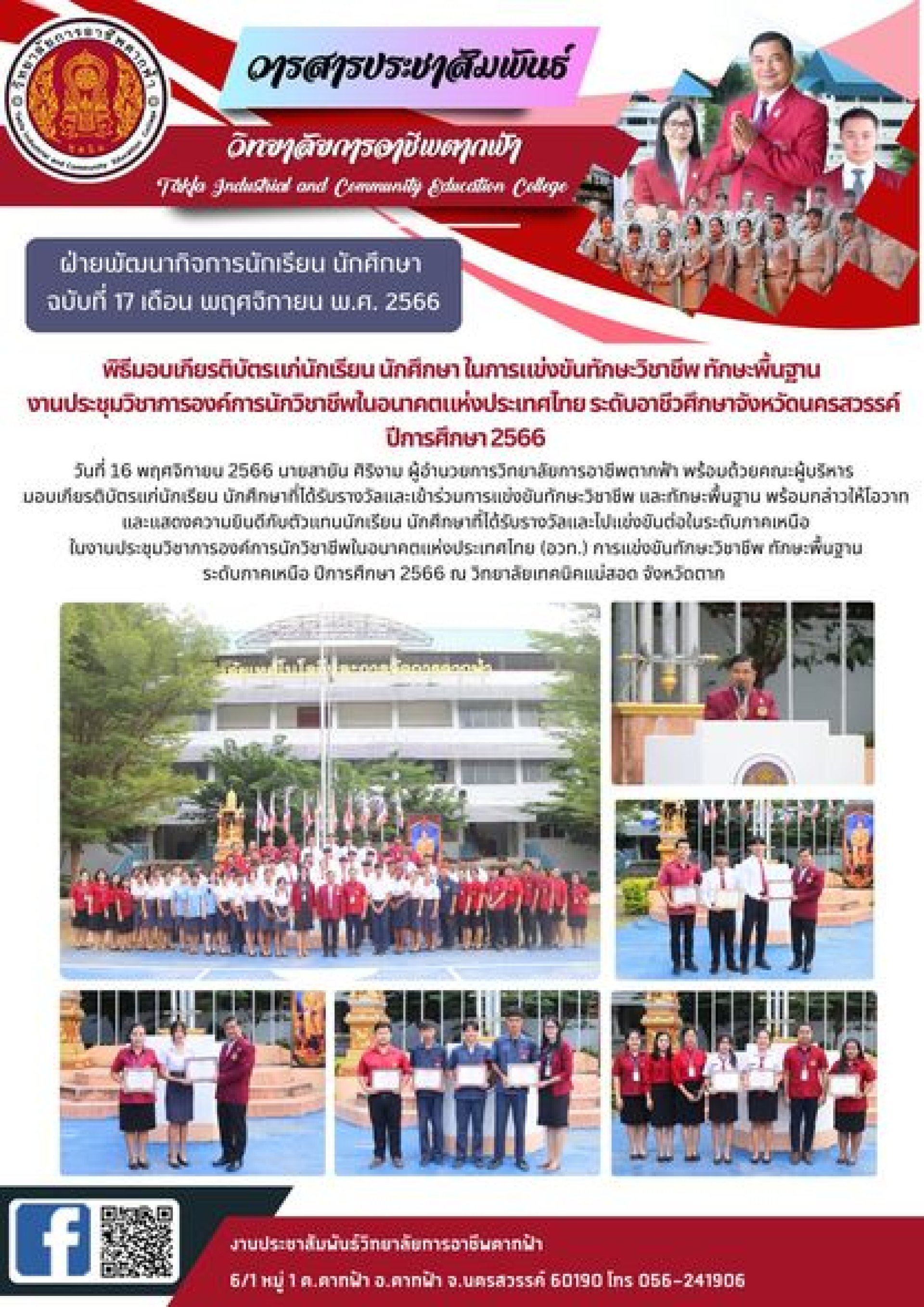 วารสารตากฟ้าประจำเดือนพฤศจิกายน 2566 ฉบับที่ 17 พิธีมอบเกียรติบัตรแก่นักเรียน นักศึกษา ในการแข่งขันทักษะวิชาชีพ ทักษะพื้นฐาน งานประชุมวิชาการองค์การนักวิชาชีพในอนาคตแห่งประเทศไทย ระดับอาชีวศึกษาจังหวัดนครสวรรค์ ปีการศึกษา 2566