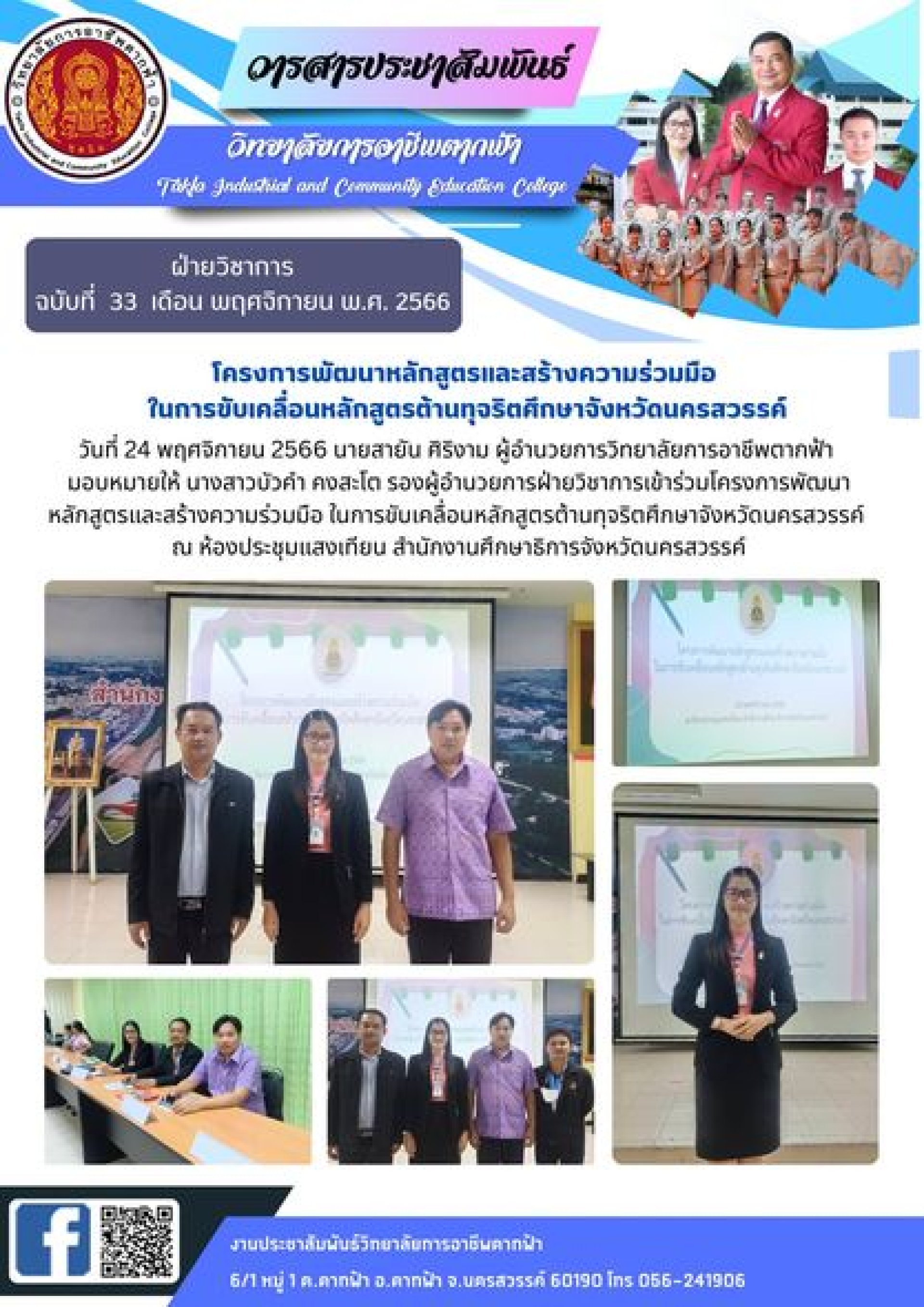 วารสารตากฟ้าประจำเดือนพฤศจิกายน 2566 ฉบับที่ 33 โครงการพัฒนาหลักสูตรและสร้างความร่วมมือ ในการขับเคลื่อนหลักสูตรต้านทุจริตศึกษาจังหวัดนครสวรรค์