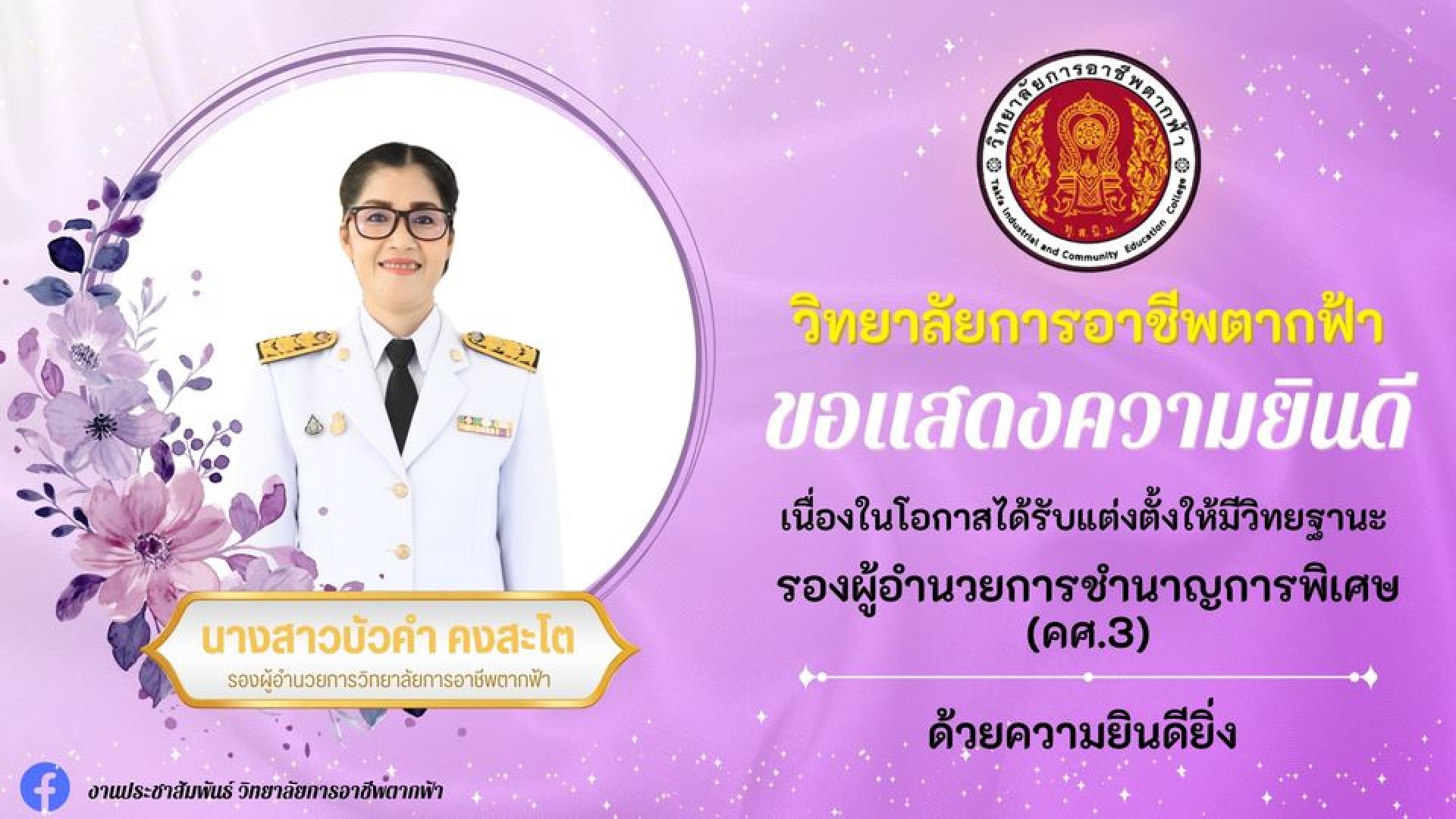 วิทยาลัยการอาชีพตากฟ้า ขอแสดงความยินดีกับ นางสาวบัวคำ คงสะโต รองผู้อำนวยการวิทยาลัยการอาชีพตากฟ้า สังกัดสำนักงานคณะกรรมการการอาชีวศึกษา เนื่องในโอกาสได้รับแต่งตั้งให้มีวิทยฐานะ รองผู้อำนวยการชำนาญการพิเศษ