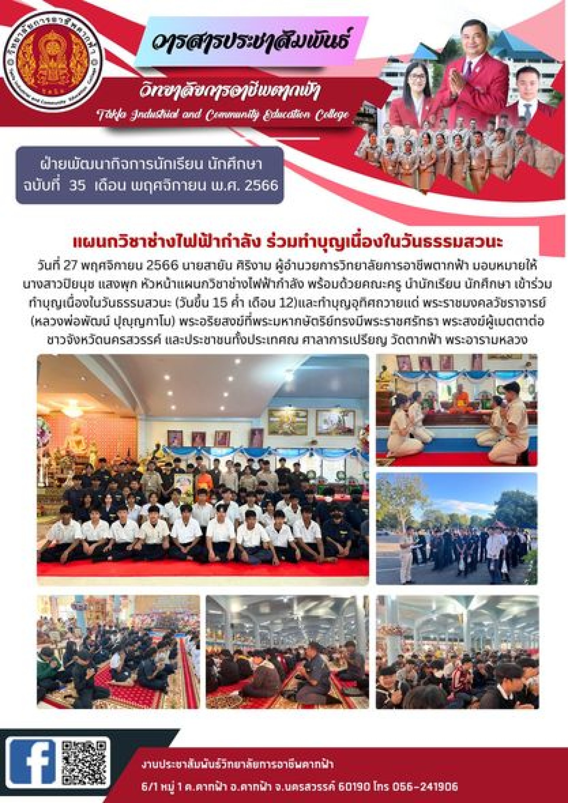 วารสารตากฟ้าประจำเดือนพฤศจิกายน 2566 ฉบับที่ 35 แผนกวิชาช่างไฟฟ้ากำลัง ร่วมทำบุญเนื่องในวันธรรมสวนะ