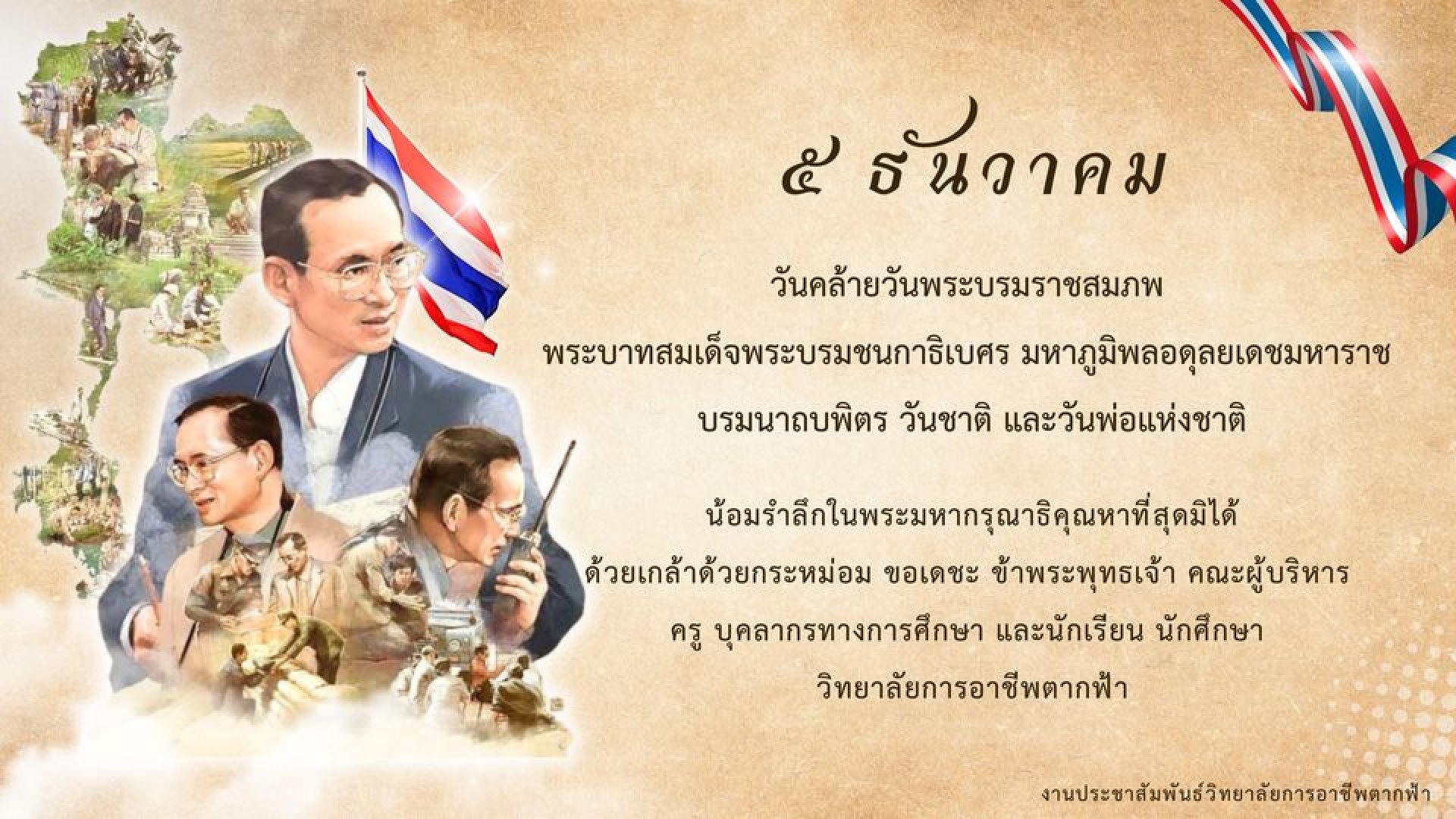 ๕ ธันวาคม ๒๕๖๖ เนื่องในวันคล้ายวันพระบรมราชสมภพ พระบาทสมเด็จพระบรมชนกาธิเบศร มหาภูมิพลอดุลยเดชมหาราช บรมนาถบพิตร "วันชาติ และวันพ่อแห่งชาติ" น้อมรำลึกในพระมหากรุณาธิคุณหาที่สุดมิได้ ด้วยเกล้าด้วยกระหม่อม ขอเดชะ ข้าพระพุทธเจ้า คณะผู้บริหาร ครู