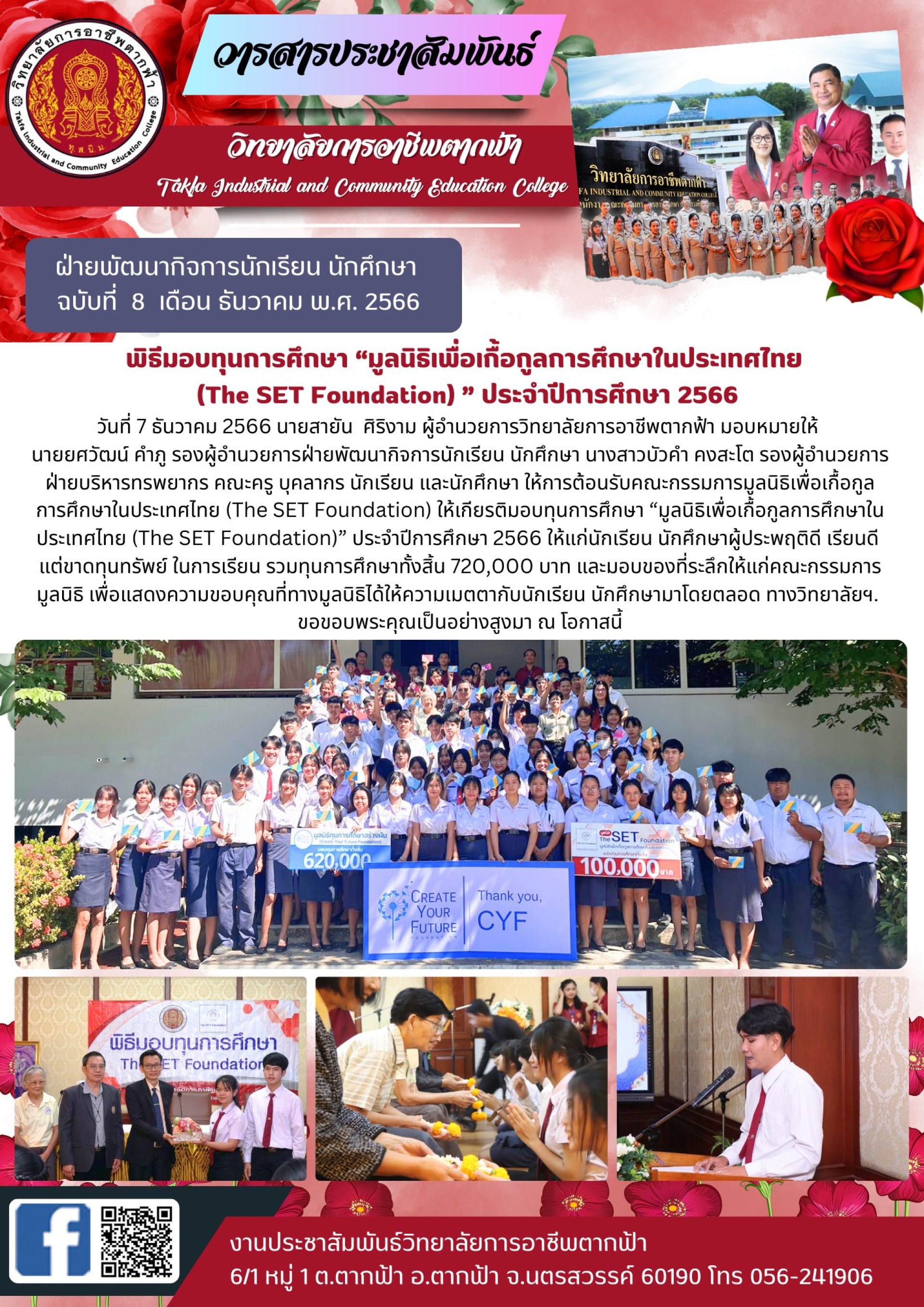 วารสารตากฟ้าประจำเดือนธันวาคม 2566 ฉบับที่ 8 พิธีมอบทุนการศึกษา มูลนิธิเพื่อเกื้อกูลการศึกษาในประเทศไทย (The SET Foundation) ประจำปีการศึกษา 2566