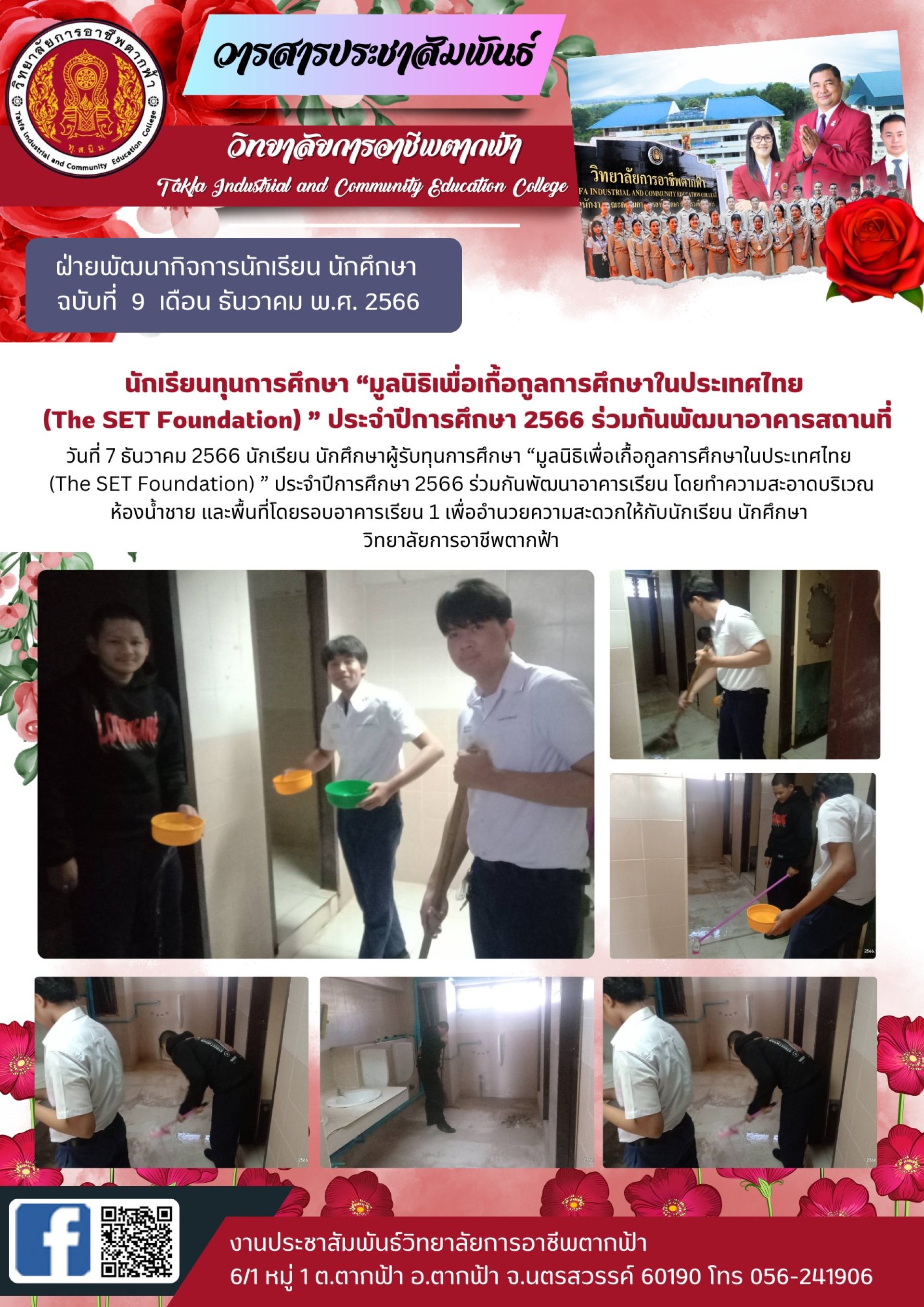 วันที่ 7 ธันวาคม 2566 นักเรียน นักศึกษาผู้รับทุนการศึกษา มูลนิธิเพื่อเกื้อกูลการศึกษาในประเทศไทย (The SET Foundation) ประจำปีการศึกษา 2566 ร่วมกันพัฒนาอาคารเรียน โดยทำความสะอาดบริเวณห้องน้ำชาย และพื้นที่โดยรอบอาคารเรียน 1 เพื่ออำนวยความสะดวกให้กับนักเรียน นักศึกษา วิทยาลัยการอาชีพตากฟ้า