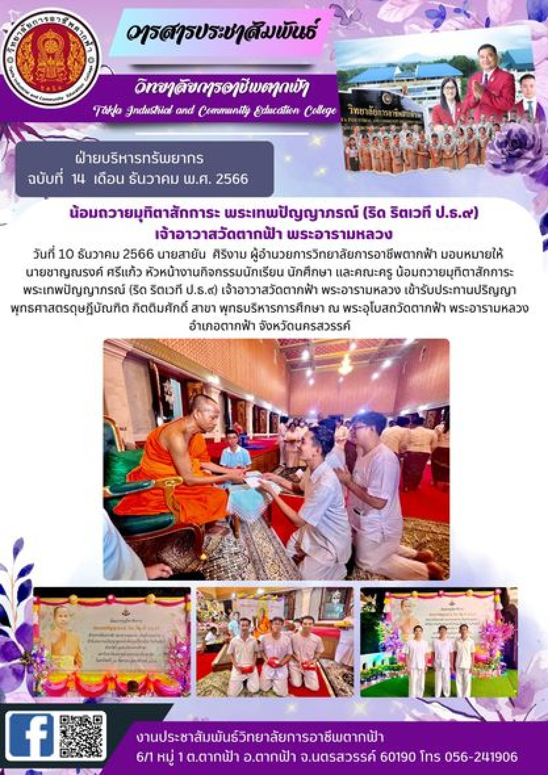 วารสารตากฟ้าประจำเดือนธันวาคม 2566 ฉบับที่ 14 น้อมถวายมุทิตาสักการะ พระเทพปัญญาภรณ์ (ริด ริตเวที ป.ธ.๙) เจ้าอาวาสวัดตากฟ้า พระอารามหลวง