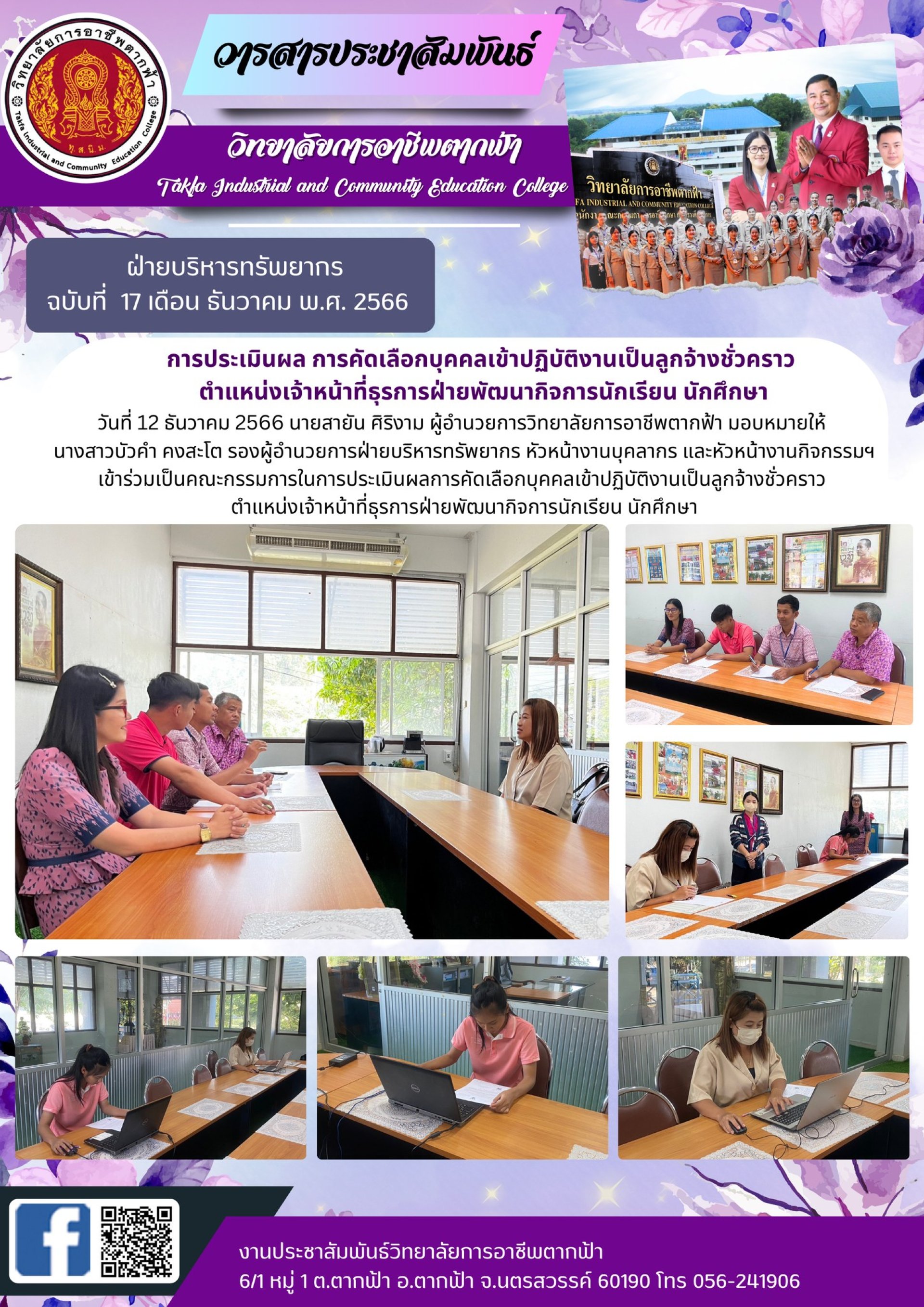 วารสารตากฟ้าประจำเดือนธันวาคม 2566 ฉบับที่ 17 การประเมินผล การคัดเลือกบุคคลเข้าปฏิบัติงานเป็นลูกจ้างชั่วคราว ตำแหน่งเจ้าหน้าที่ธุรการฝ่ายพัฒนากิจการนักเรียน นักศึกษา