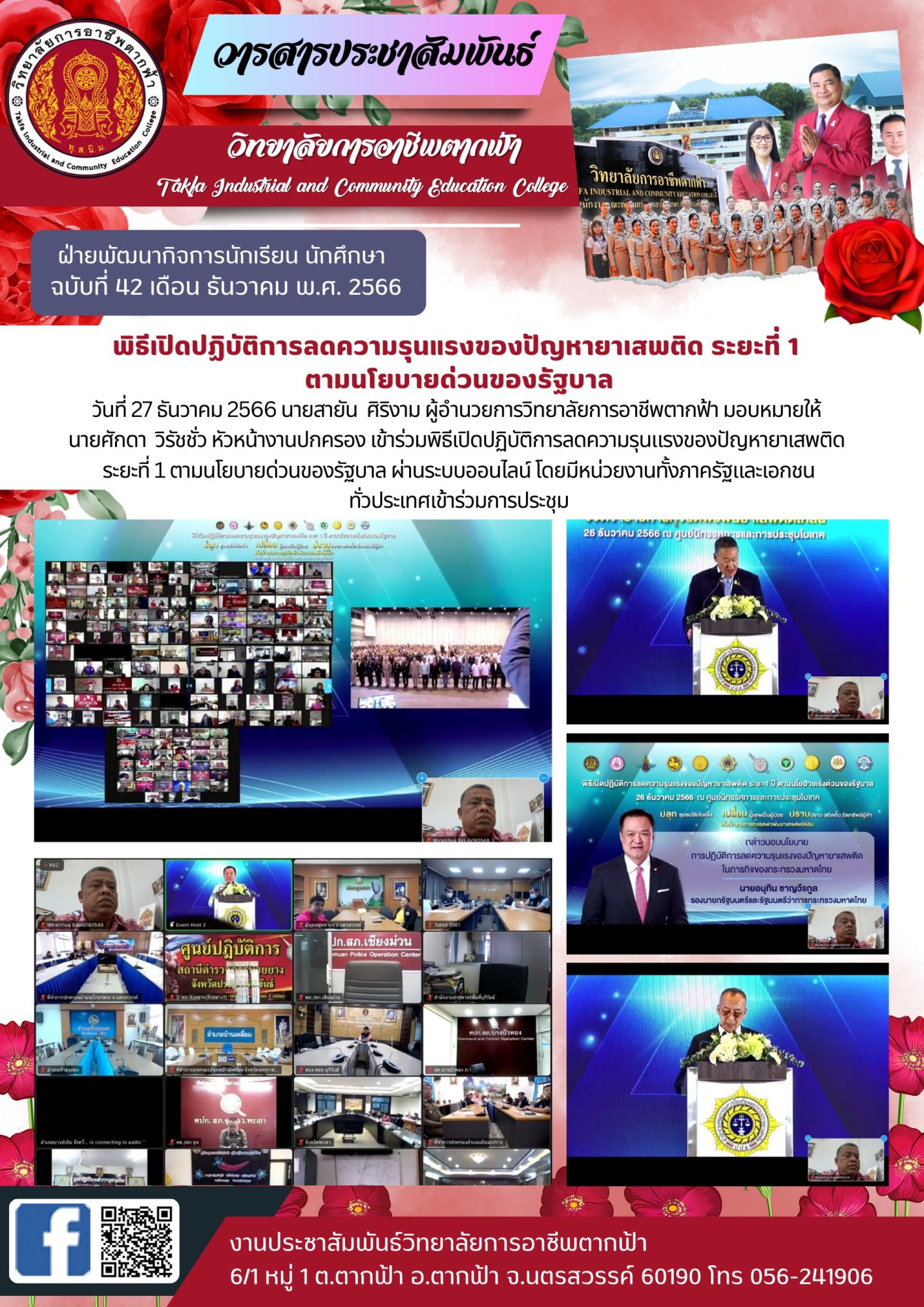 วันที่ 27 ธันวาคม 2566 นายสายัน ศิริงาม ผู้อำนวยการวิทยาลัยการอาชีพตากฟ้า มอบหมายให้ นายศักดา วิรัชชั่ว หัวหน้างานปกครอง เข้าร่วมพิธีเปิดปฏิบัติการลดความรุนแรงของปัญหายาเสพติด ระยะที่ 1 ตามนโยบายด่วนของรัฐบาล ผ่านระบบออนไลน์ โดยมีหน่วยงานทั้งภาครัฐและเอกชน ทั่วประเทศเข้าร่วมการประชุม