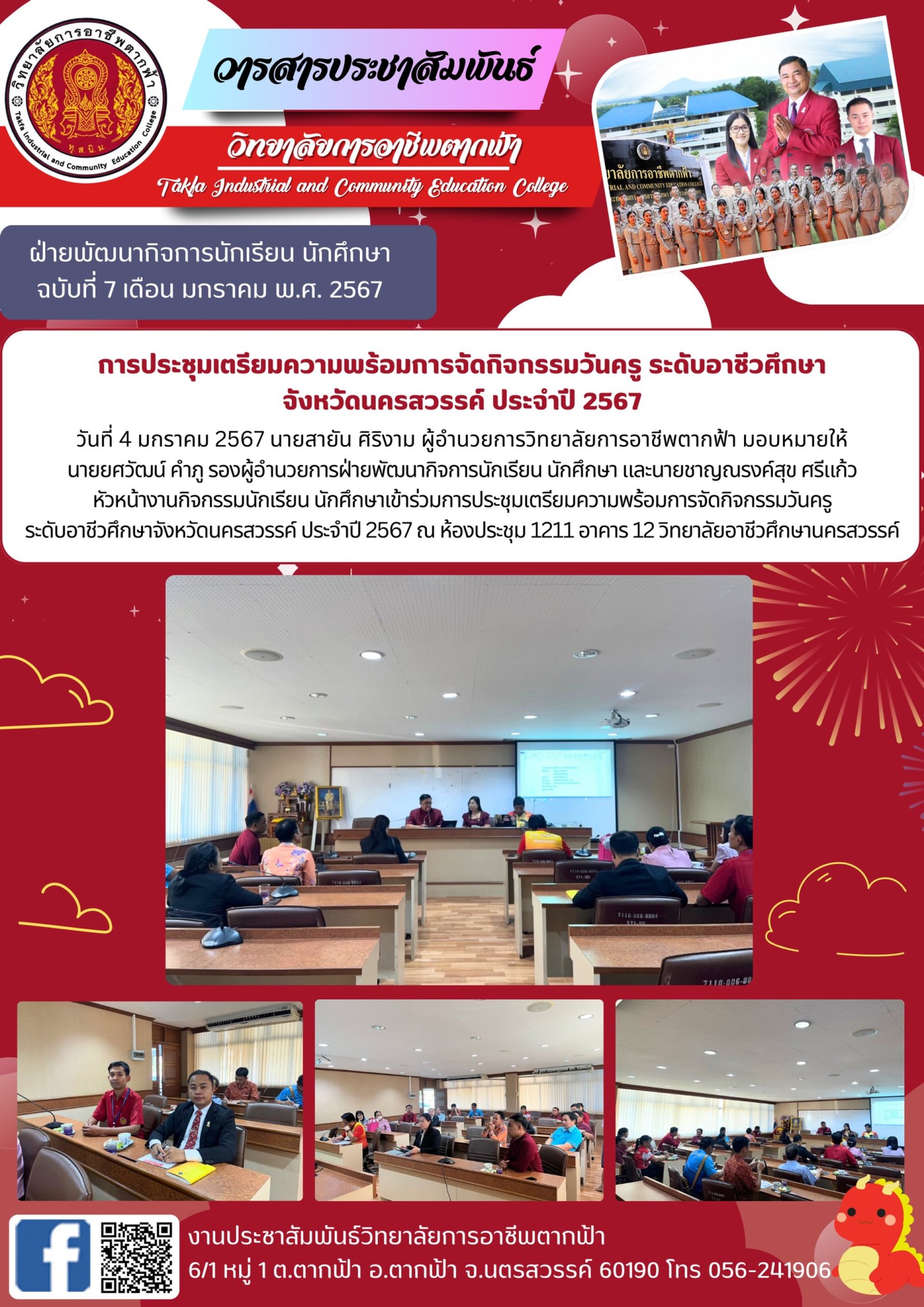 วารสารตากฟ้า ประจำเดือน มกราคม 2567 ฉบับที่ 7 การประชุมเตรียมความพร้อมการจัดกิจกรรมวันครู ระดับอาชีวศึกษาจังหวัดนครสวรรค์ ประจำปี 2567