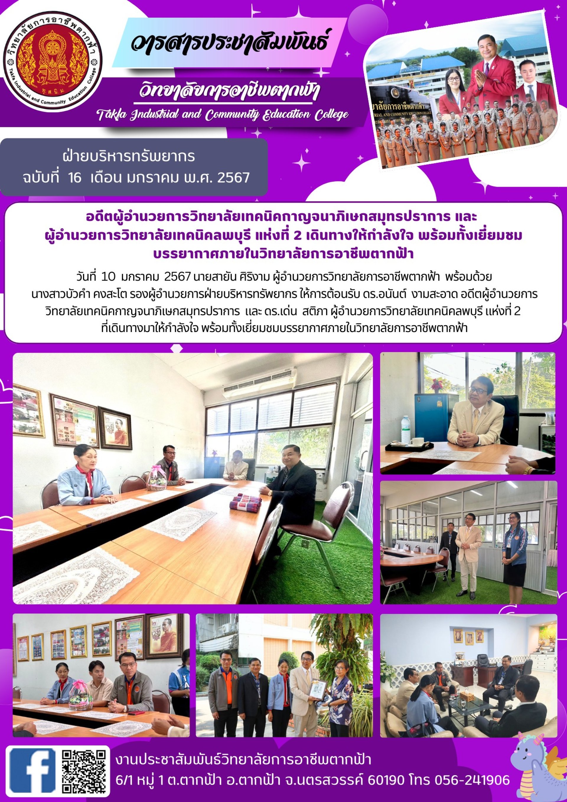 วารสารตากฟ้า ประจำเดือน มกราคม 2567 ฉบับที่ 16 อดีตผู้อำนวยการวิทยาลัยเทคนิคกาญจนาภิเษกสมุทรปราการและ ผู้อำนวยการวิทยาลัยเทคนิคลพบุรี แห่งที่ 2 เดินทางให้กำลังใจ พร้อมทั้งเยี่ยมชมบรรยากาศภายในวิทยาลัยการอาชีพตากฟ้า