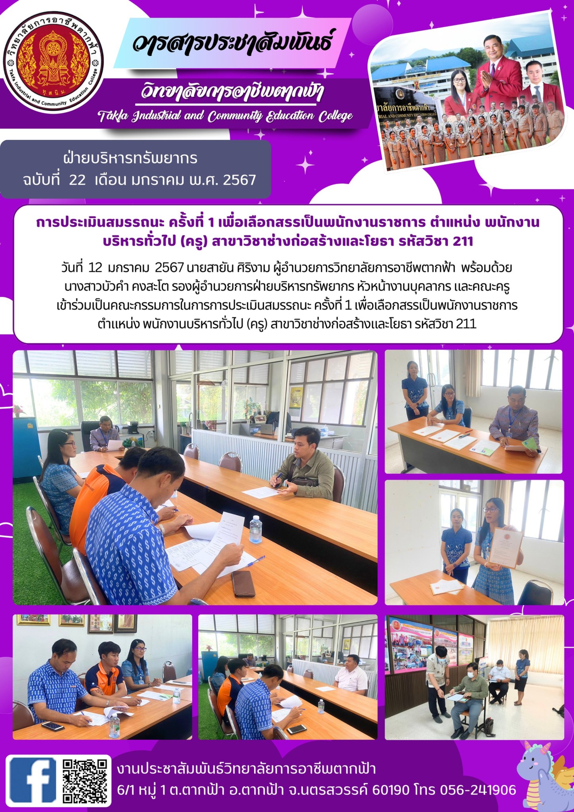 วารสารตากฟ้า ประจำเดือน มกราคม 2567 ฉบับที่ 22 การประเมินสมรรถนะ ครั้งที่ 1 เพื่อเลือกสรรเป็นพนักงานราชการ ตำแหน่ง พนักงานบริหารทั่วไป (ครู) สาขาวิชาช่างก่อสร้างและโยธา รหัสวิชา 211