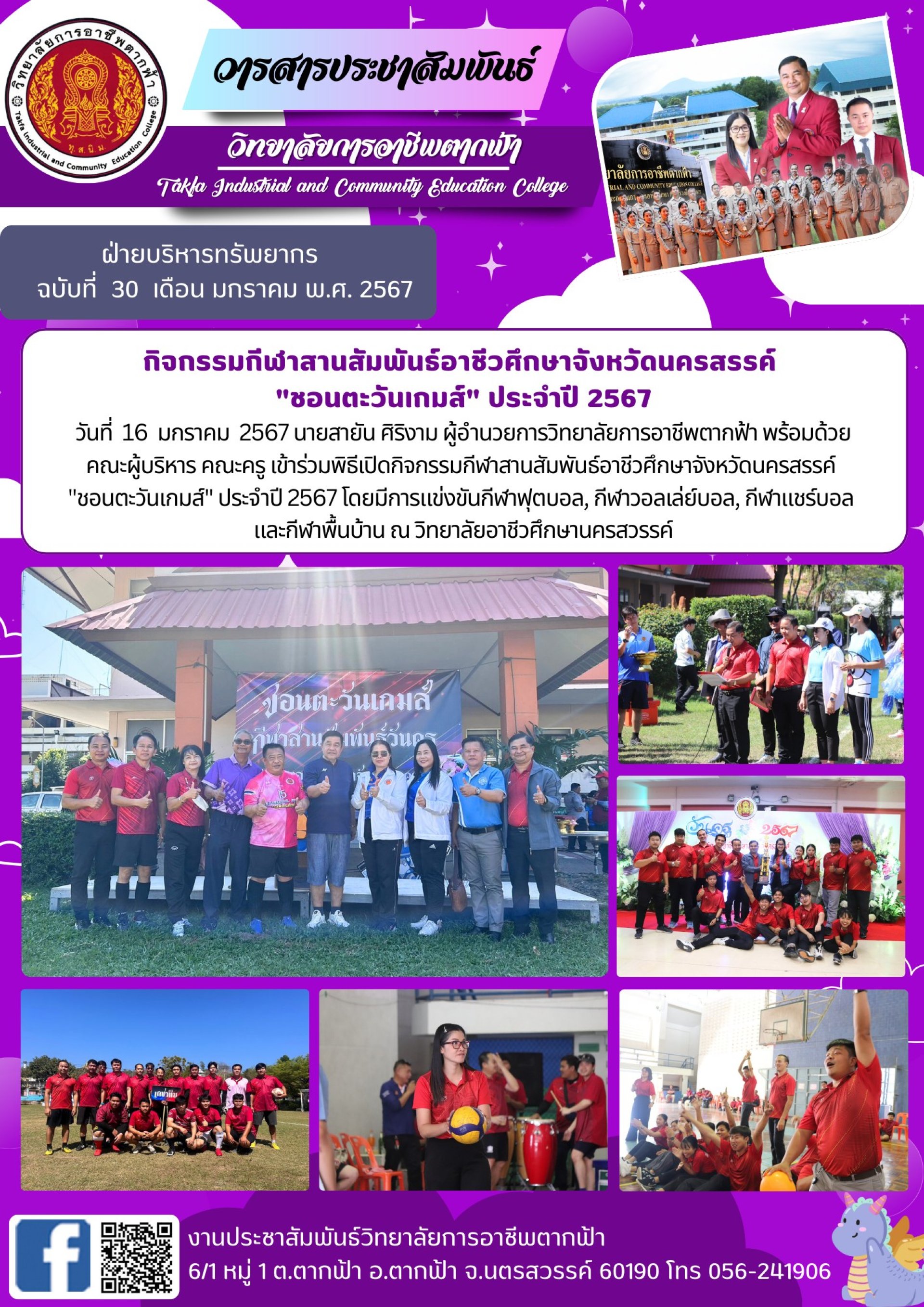 วารสารตากฟ้า ประจำเดือน มกราคม 2567 ฉบับที่ 30 กิจกรรมกีฬาสานสัมพันธ์อาชีวศึกษาจังหวัดนครสรรค์ "ชอนตะวันเกมส์" ประจำปี 2567