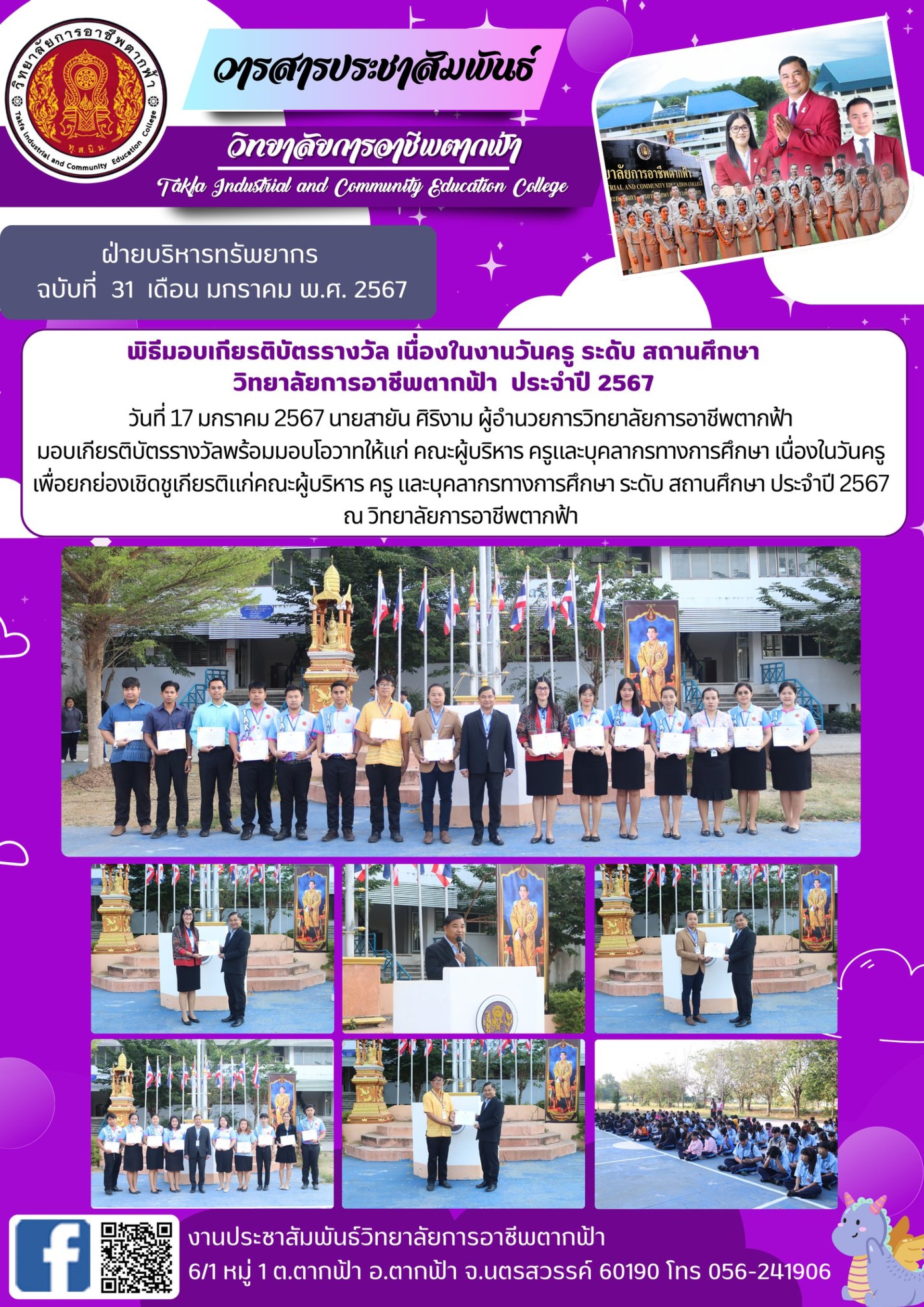 วารสารตากฟ้า ประจำเดือน มกราคม 2567 ฉบับที่ 31 พิธีมอบเกียรติบัตรรางวัล เนื่องในงานวันครู ระดับ สถานศึกษา วิทยาลัยการอาชีพตากฟ้า ประจำปี 2567