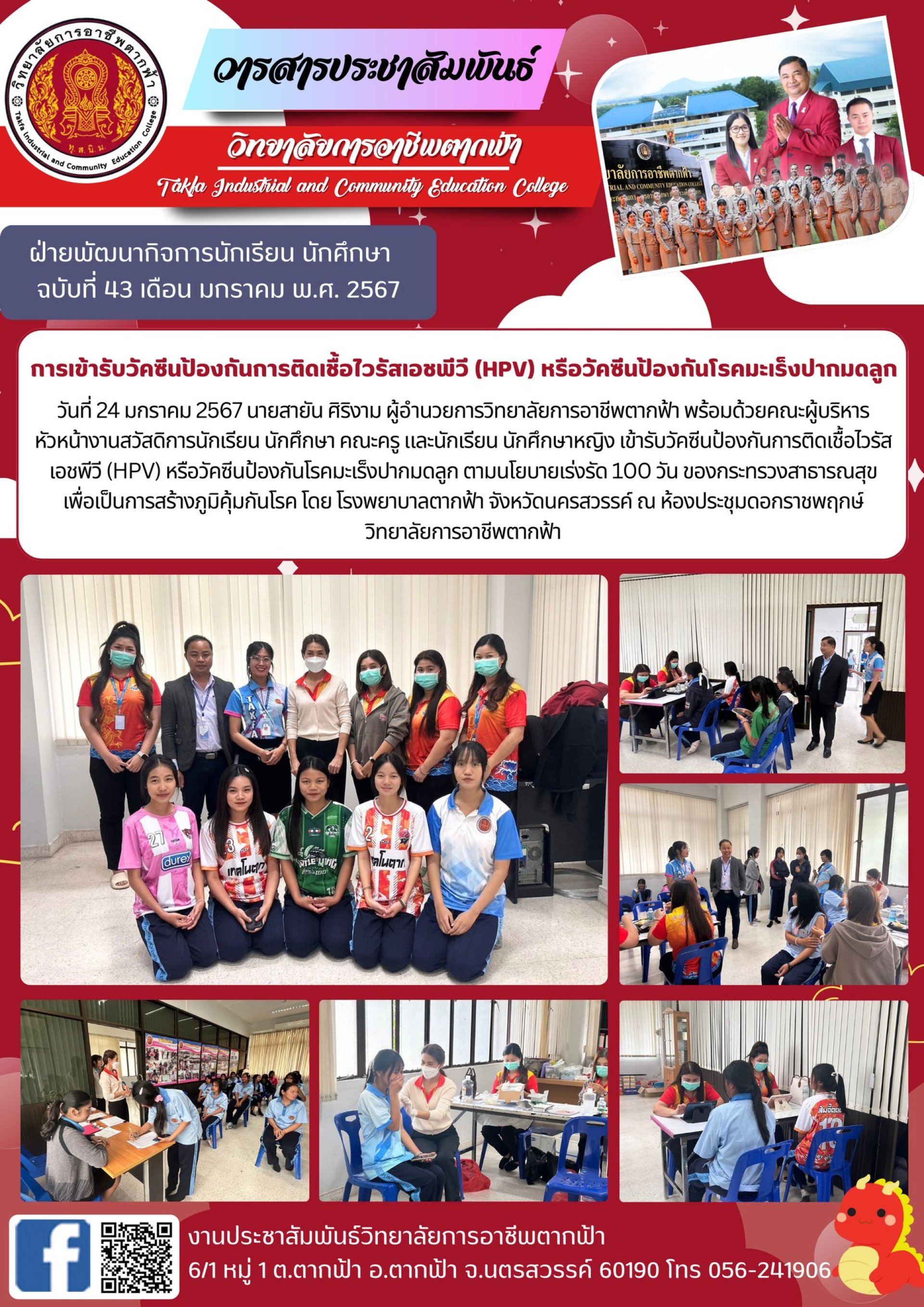 วันที่ 24 มกราคม 2567 นายสายัน ศิริงาม ผู้อำนวยการวิทยาลัยการอาชีพตากฟ้า พร้อมด้วยคณะผู้บริหาร หัวหน้างานสวัสดิการนักเรียน นักศึกษา คณะครู และนักเรียน นักศึกษาหญิง เข้ารับวัคซีนป้องกันการติดเชื้อไวรัสเอชพีวี (HPV) หรือวัคซีนป้องกันโรคมะเร็งปากมดลูก ตามนโยบายเร่งรัด 100 วัน ของกระทรวงสาธารณสุข เพื่อเป็นการสร้างภูมิคุ้มกันโรค โดย โรงพยาบาลตากฟ้า จังหวัดนครสวรรค์ ณ ห้องประชุมดอกราชพฤกษ์