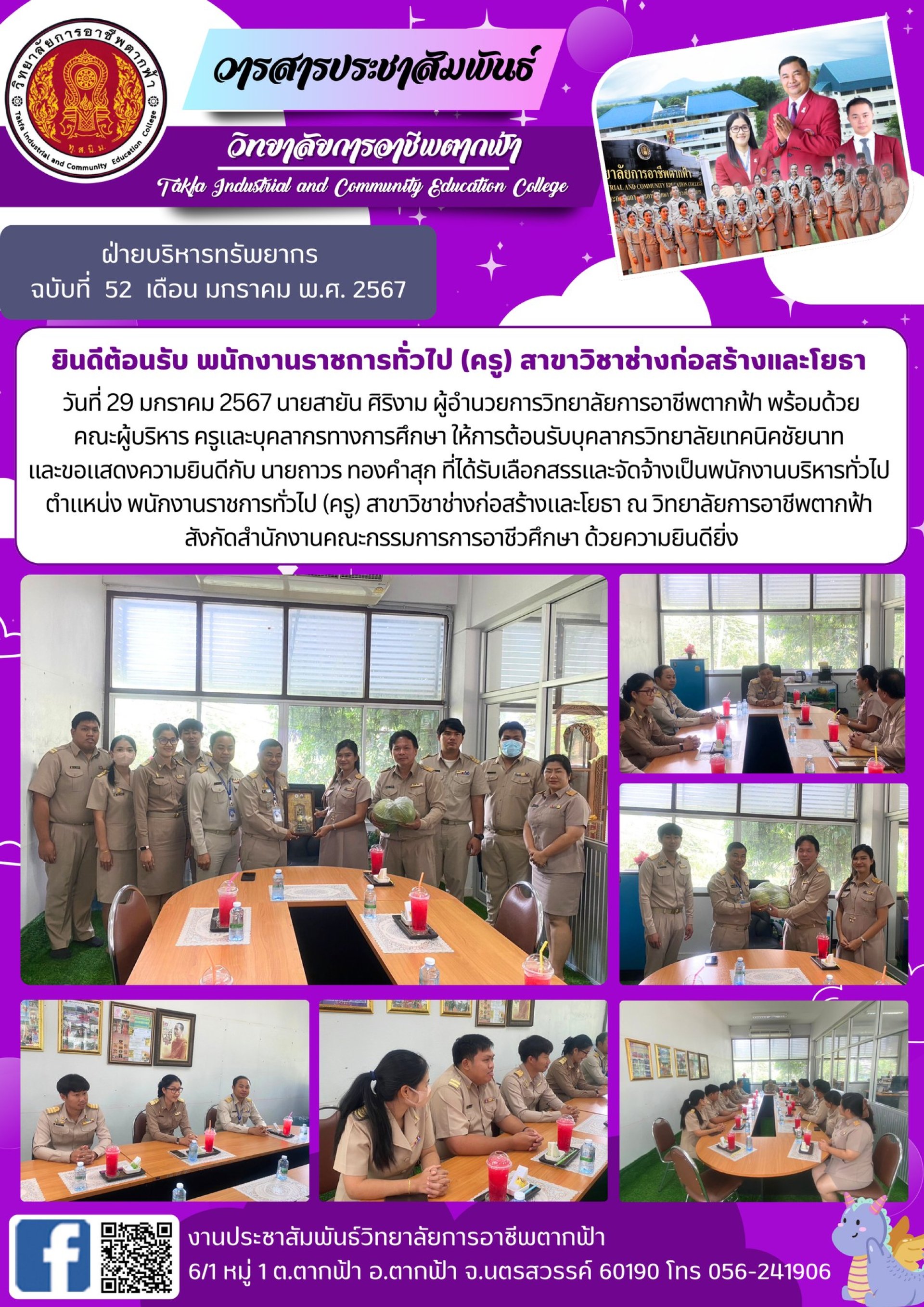 วารสารตากฟ้า ประจำเดือน มกราคม 2567 ฉบับที่ 52 ยินดีต้อนรับ พนักงานราชการทั่วไป (ครู) สาขาวิชาช่างก่อสร้างและโยธา