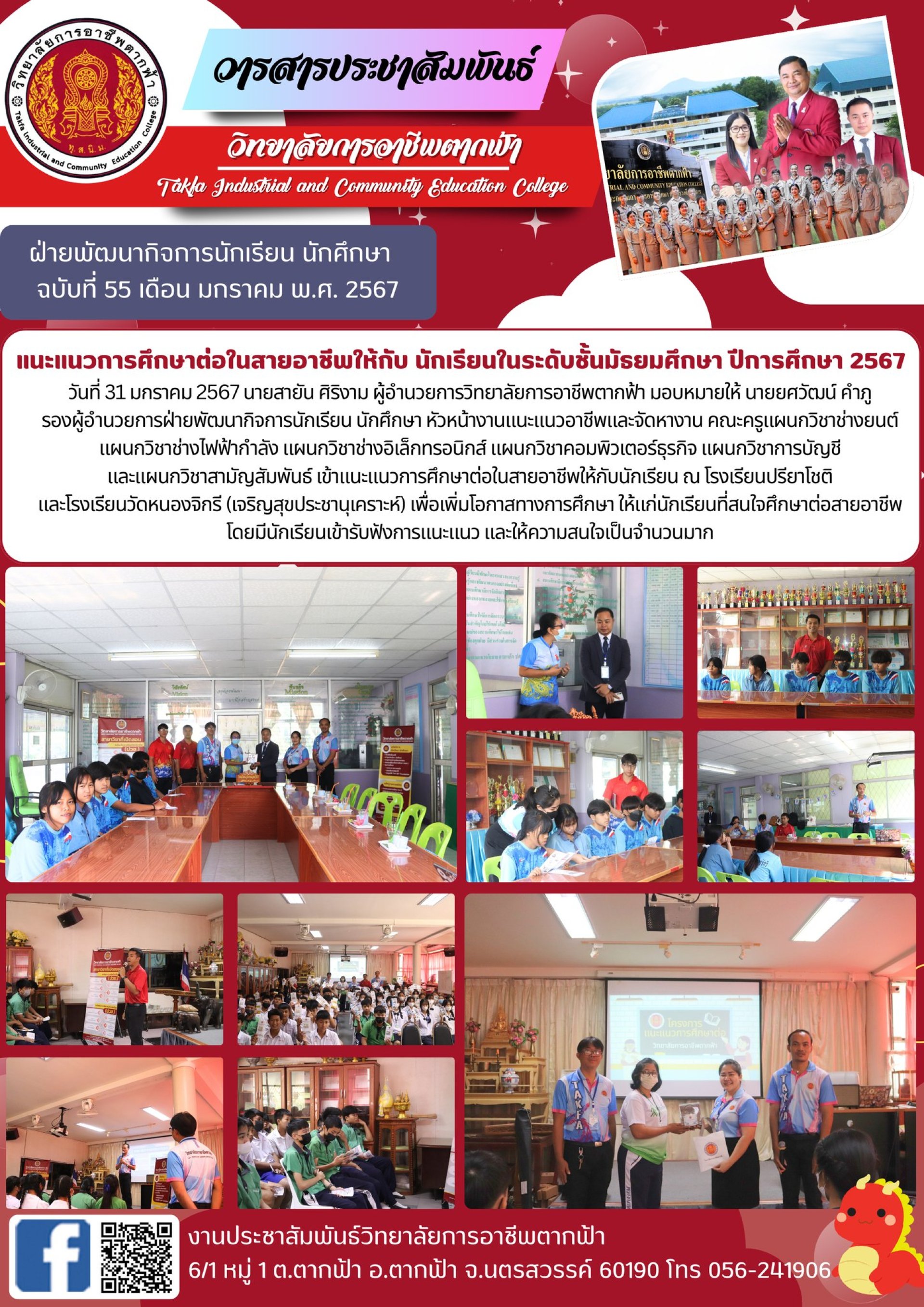 วารสารตากฟ้า ประจำเดือน มกราคม 2567 ฉบับที่ 55 แนะแนวการศึกษาต่อในสายอาชีพให้กับ นักเรียนในระดับชั้นมัธยมศึกษา ปีการศึกษา 2567