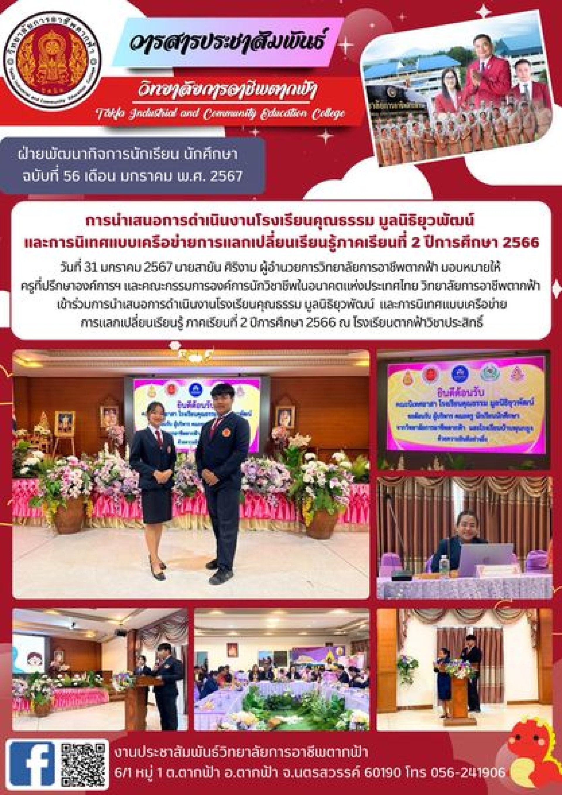 วารสารตากฟ้า ประจำเดือน มกราคม 2567 ฉบับที่ 56 การนำเสนอการดำเนินงานโรงเรียนคุณธรรม มูลนิธิยุวพัฒน์ และการนิเทศแบบเครือข่ายการแลกเปลี่ยนเรียนรู้ภาคเรียนที่ 2 ปีการศึกษา 2566