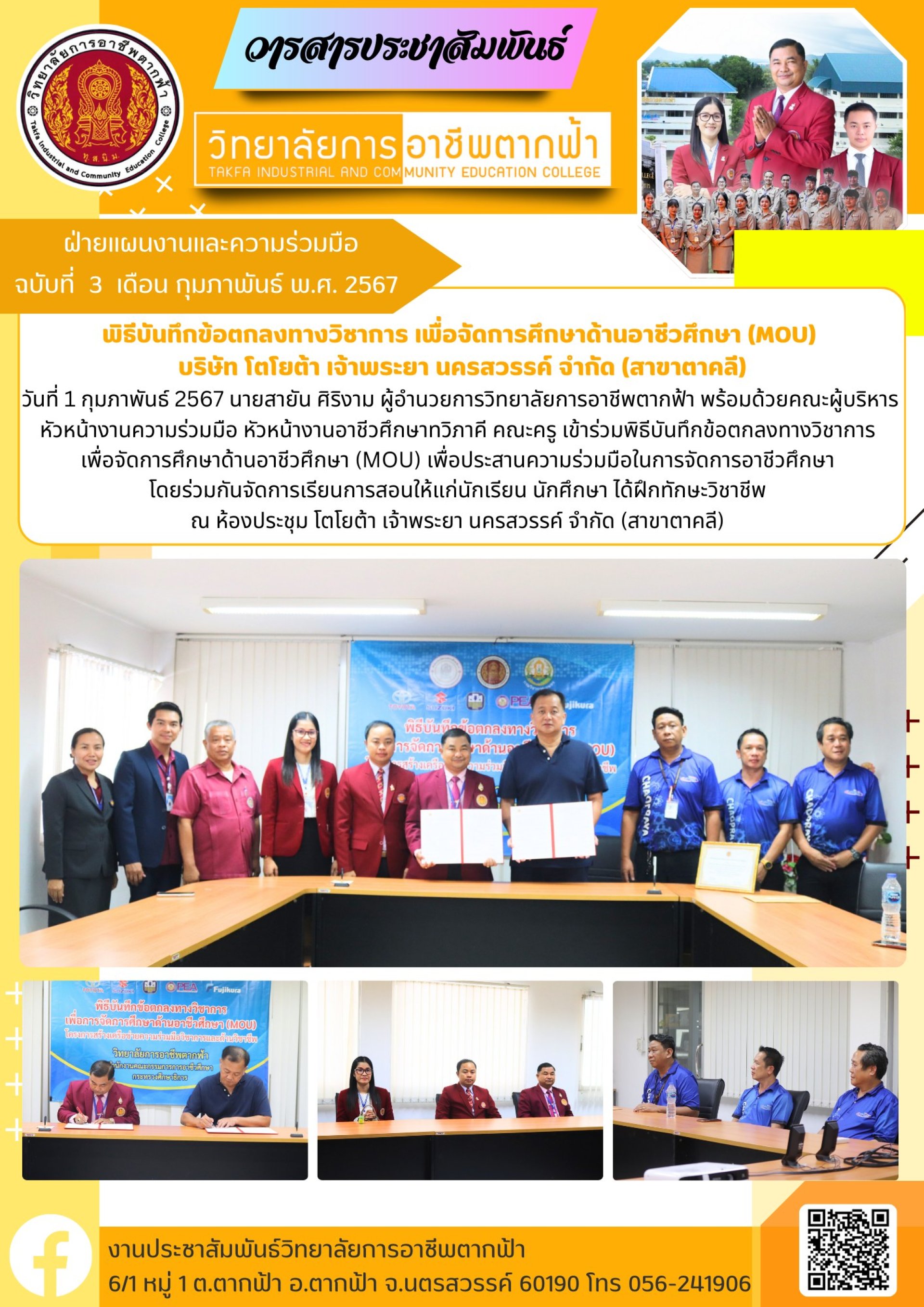 วารสารตากฟ้า ประจำเดือน กุมภาพันธ์ 2567 ฉบับที่ 3 พิธีบันทึกข้อตกลงทางวิชาการ เพื่อจัดการศึกษาด้านอาชีวศึกษา (MOU) บริษัท โตโยต้า เจ้าพระยา นครสวรรค์ จำกัด (สาขาตาคลี)