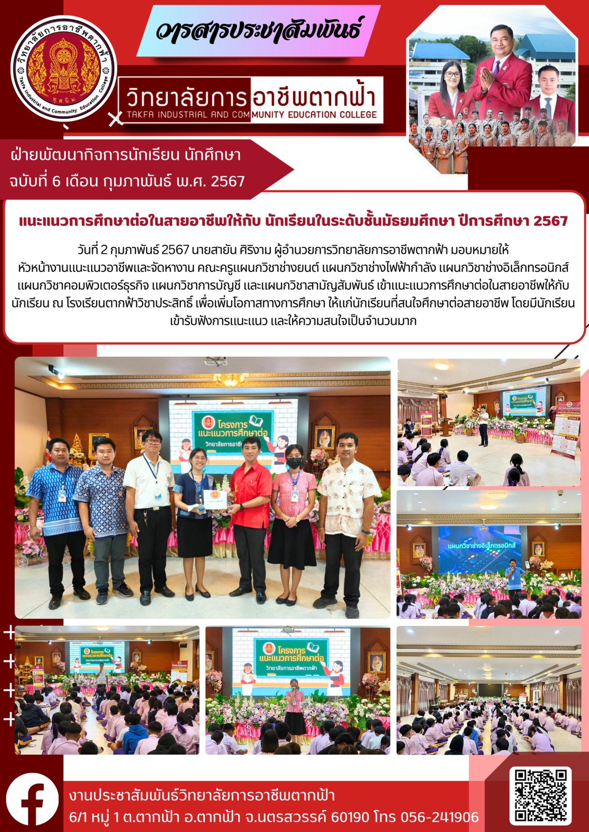 วารสารตากฟ้า ประจำเดือน กุมภาพันธ์ 2567 ฉบับที่ 6 แนะแนวการศึกษาต่อในสายอาชีพให้กับ นักเรียนในระดับชั้นมัธยมศึกษา ปีการศึกษา 2567