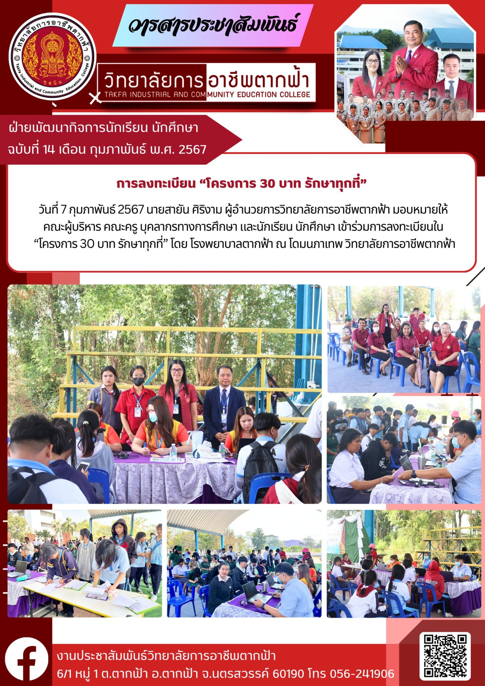 วันที่ 7 กุมภาพันธ์ 2567 นายสายัน ศิริงาม ผู้อำนวยการวิทยาลัยการอาชีพตากฟ้า มอบหมายให้ คณะผู้บริหาร คณะครู บุคลากรทางการศึกษา และนักเรียน นักศึกษา เข้าร่วมการลงทะเบียนใน โครงการ 30 บาท รักษาทุกที่ โดย โรงพยาบาลตากฟ้า ณ โดมนภาเทพ วิทยาลัยการอาชีพตากฟ้า