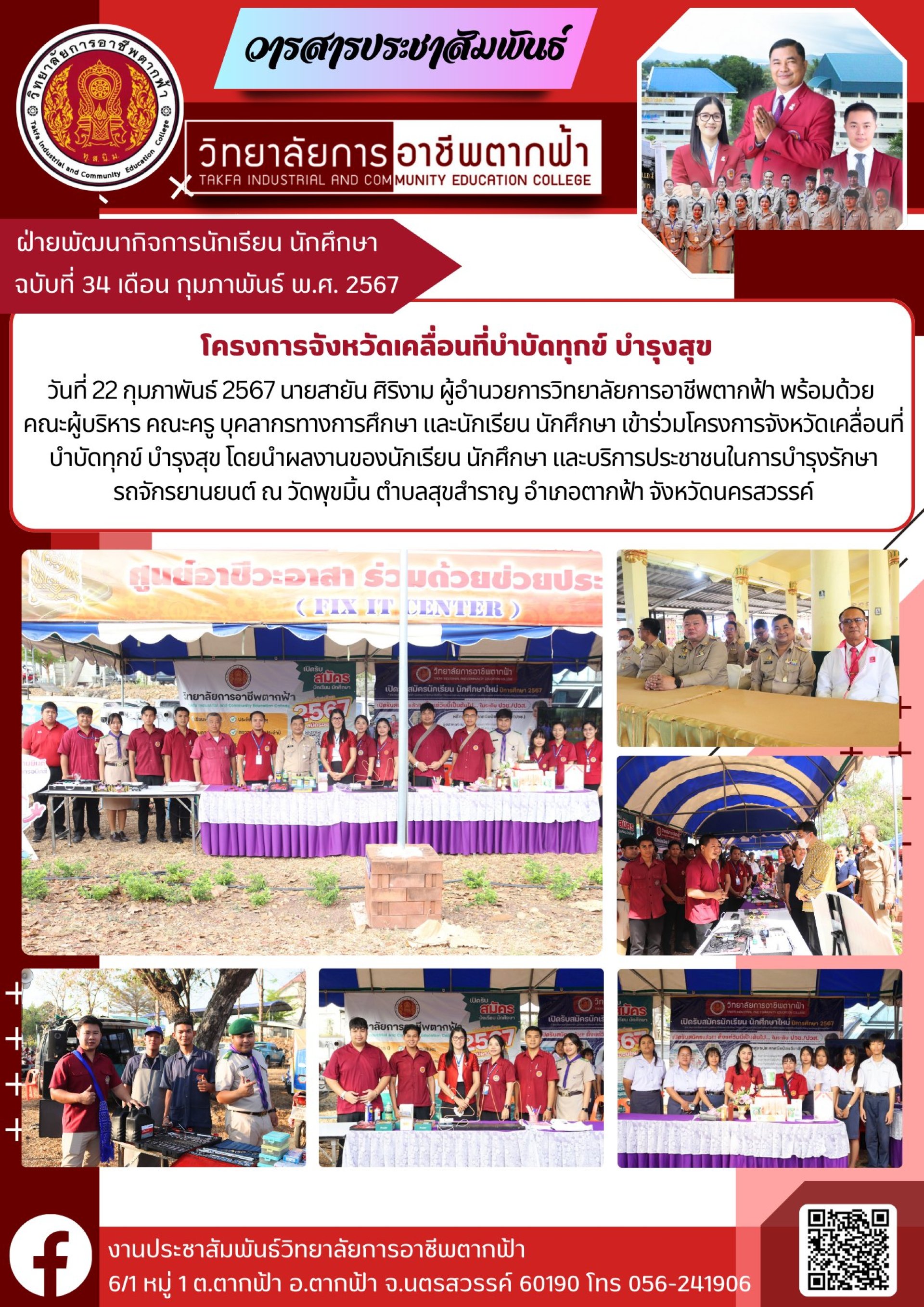 วันที่ 22 กุมภาพันธ์ 2567 นายสายัน ศิริงาม ผู้อำนวยการวิทยาลัยการอาชีพตากฟ้า พร้อมด้วย คณะผู้บริหาร คณะครู บุคลากรทางการศึกษา และนักเรียน นักศึกษา เข้าร่วมโครงการจังหวัดเคลื่อนที่บำบัดทุกข์ บำรุงสุข โดยนำผลงานของนักเรียน นักศึกษา และบริการประชาชนในการบำรุงรักษารถจักรยานยนต์ ณ วัดพุขมิ้น ตำบลสุขสำราญ อำเภอตากฟ้า จังหวัดนครสวรรค์