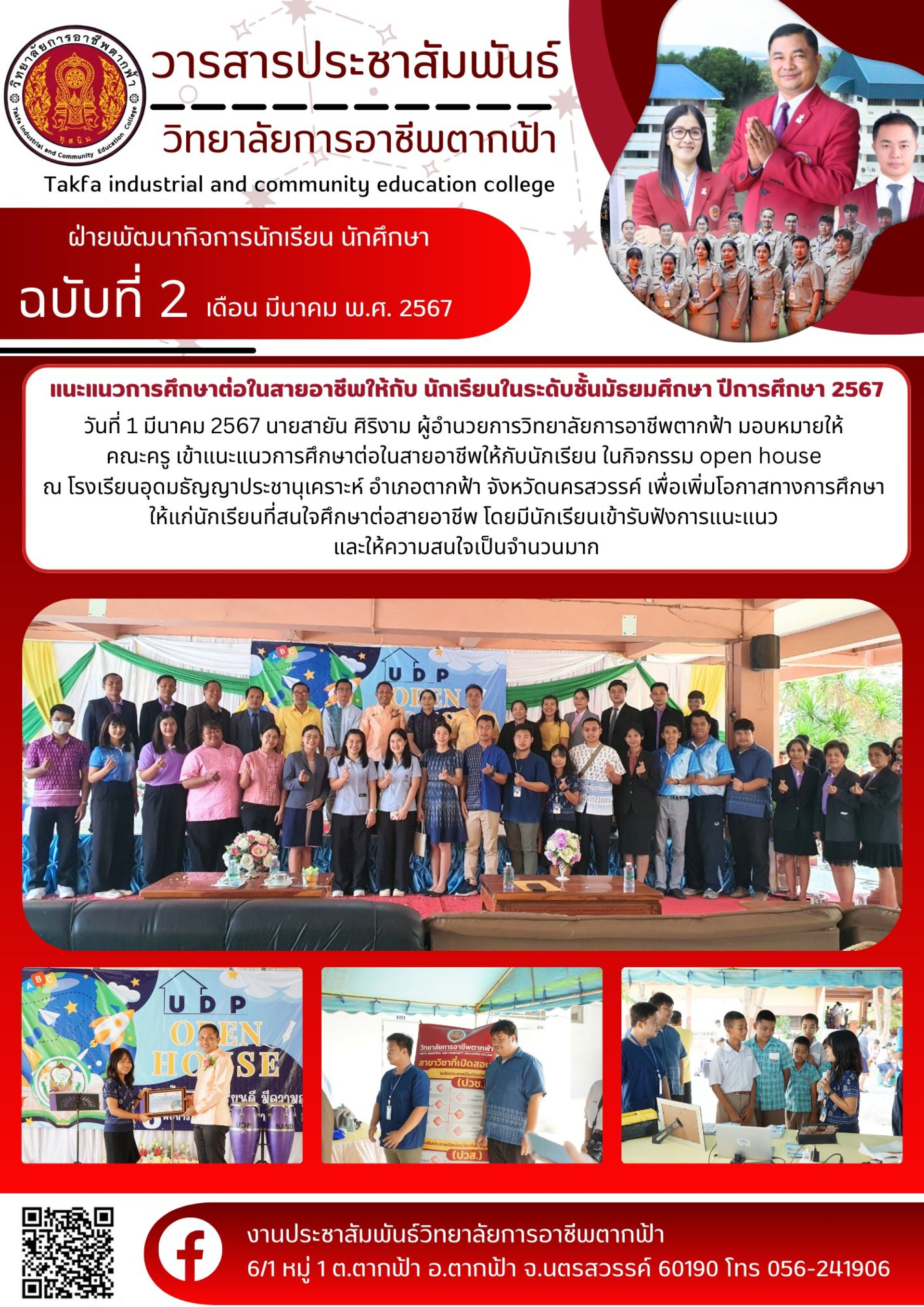 วารสารตากฟ้า ประจำเดือน มีนาคม 2567 ฉบับที่ 2 แนะแนวการศึกษาต่อในสายอาชีพให้กับ นักเรียนในระดับชั้นมัธยมศึกษา ปีการศึกษา 2567