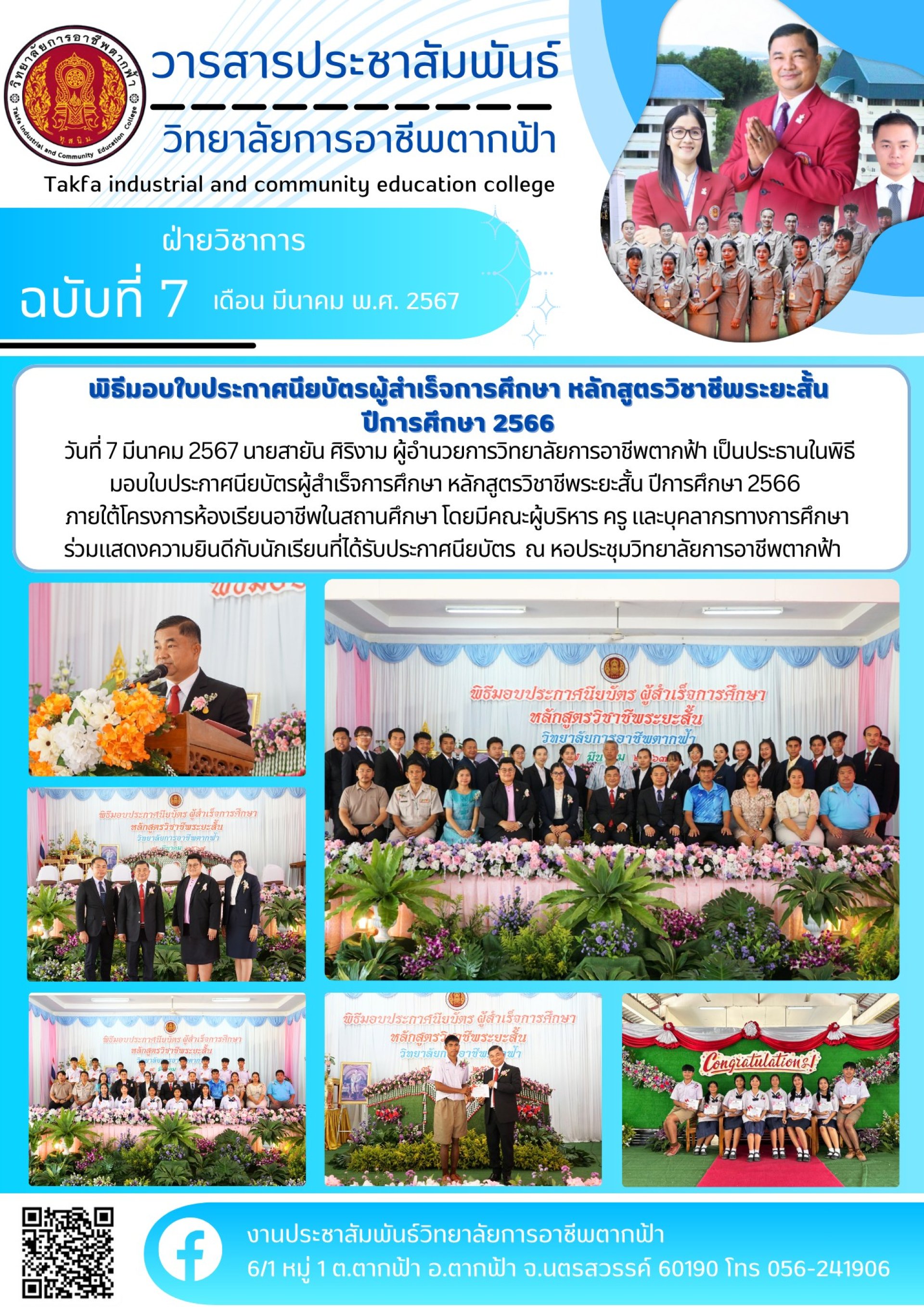 วารสารตากฟ้า ประจำเดือน มีนาคม 2567 ฉบับที่ 7 พิธีมอบใบประกาศนียบัตรผู้สำเร็จการศึกษา หลักสูตรวิชาชีพระยะสั้น ปีการศึกษา 2566 วันที่ 7 มีนาคม 2567 นายสายัน ศิริงาม ผู้อำนวยการวิทยาลัยการอาชีพตากฟ้า เป็นประธานในพิธีมอบใบประกาศนียบัตรผู้สำเร็จการศึกษา หลักส