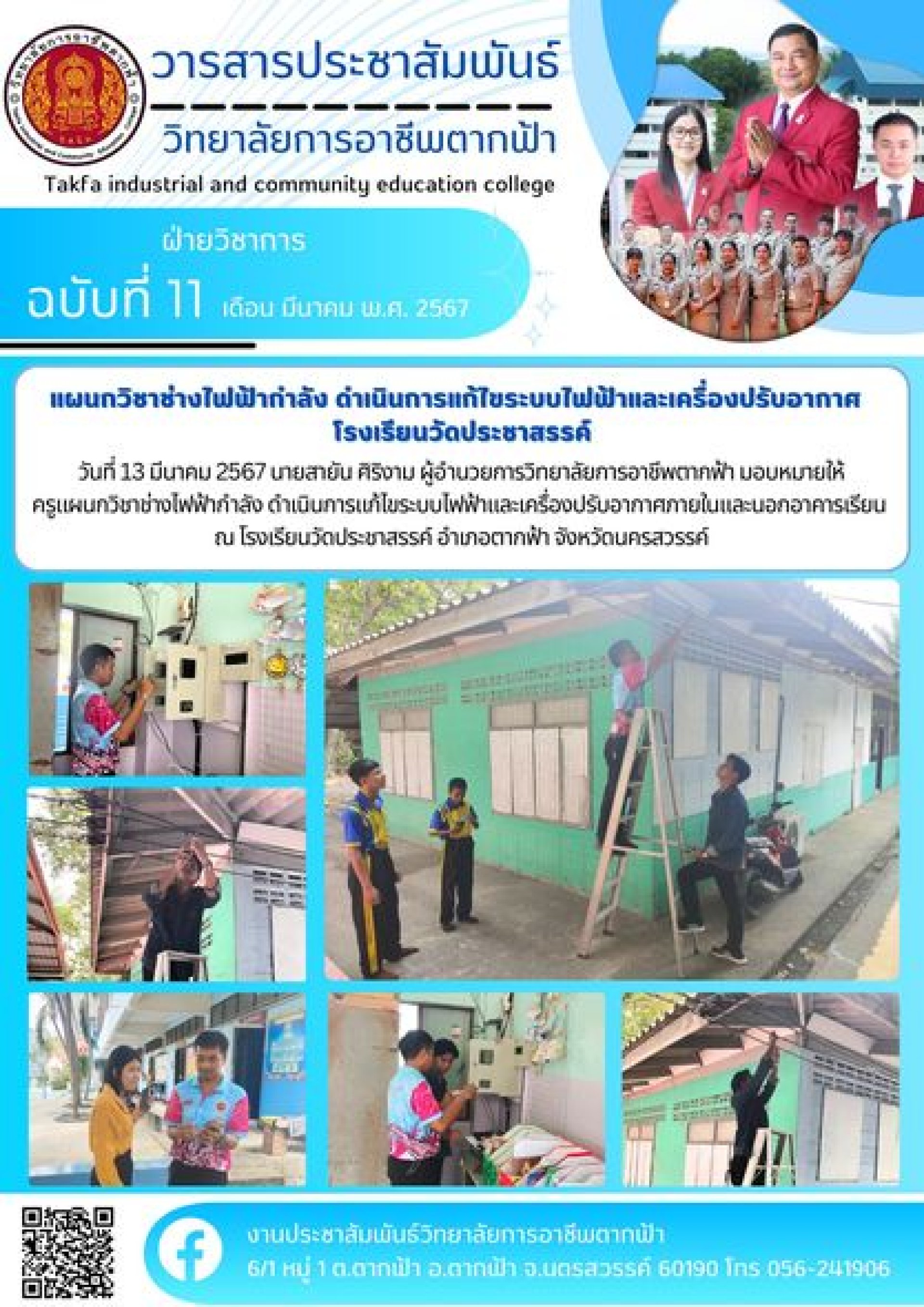วารสารตากฟ้า ประจำเดือน มีนาคม 2567 ฉบับที่ 11 แผนกวิชาช่างไฟฟ้ากำลัง ดำเนินการแก้ไขระบบไฟฟ้าและเครื่องปรับอากาศ โรงเรียนวัดประชาสรรค์