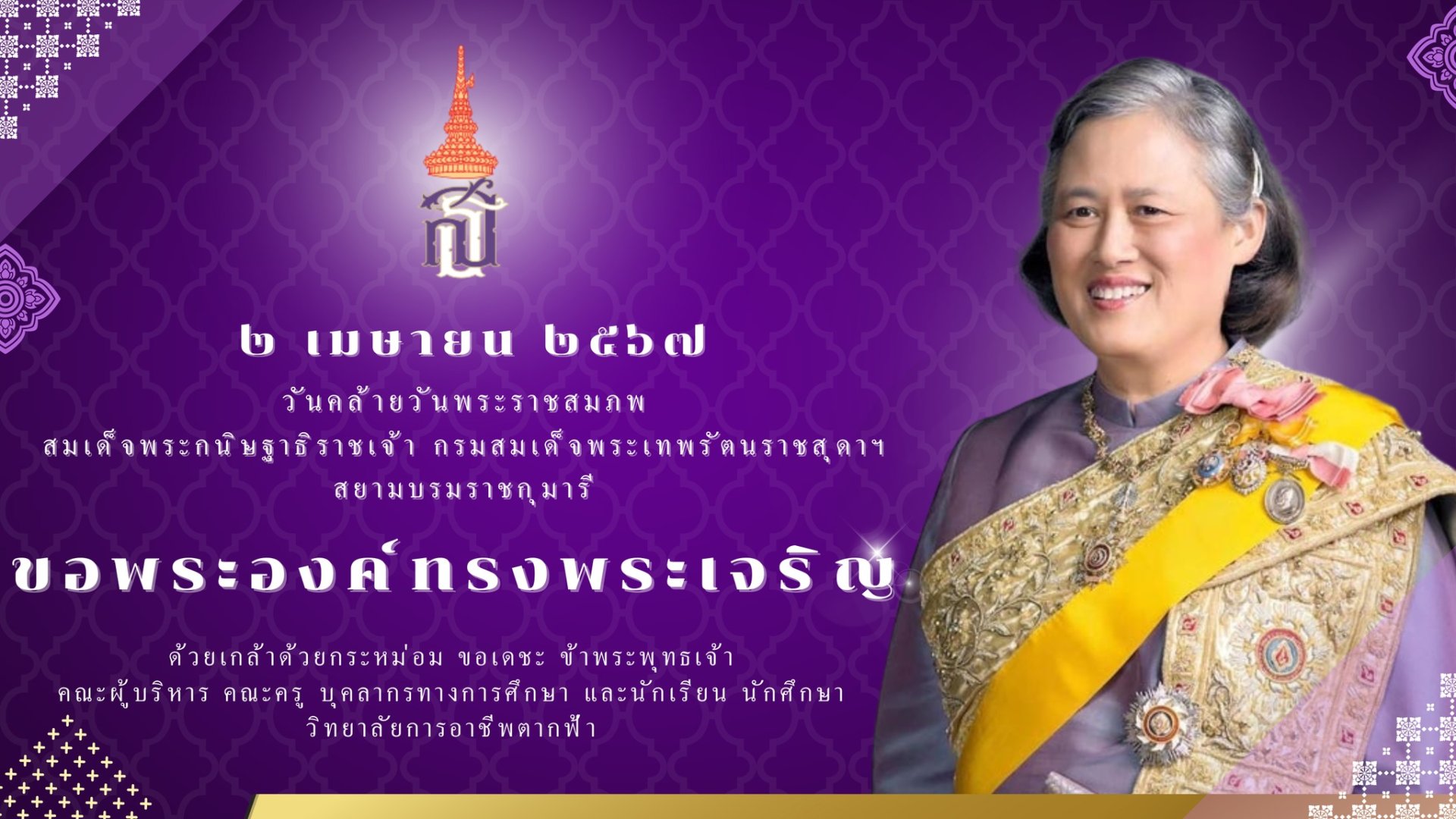๒ เมษายน ๒๕๖๗ วันคล้ายวันพระราชสมภพ สมเด็จพระกนิษฐาธิราชเจ้า กรมสมเด็จพระเทพรัตนราชสุดาฯ สยามบรมราชกุมารี ขอพระองค์ทรงพระเจริญ ด้วยเกล้าด้วยกระหม่อม ขอเดชะ ข้าพระพุทธเจ้า คณะผู้บริหาร คณะครู บุคลากรทางการศึกษา และนักเรียน นักศึกษา วิทยาลัยการอาชีพตากฟ้า