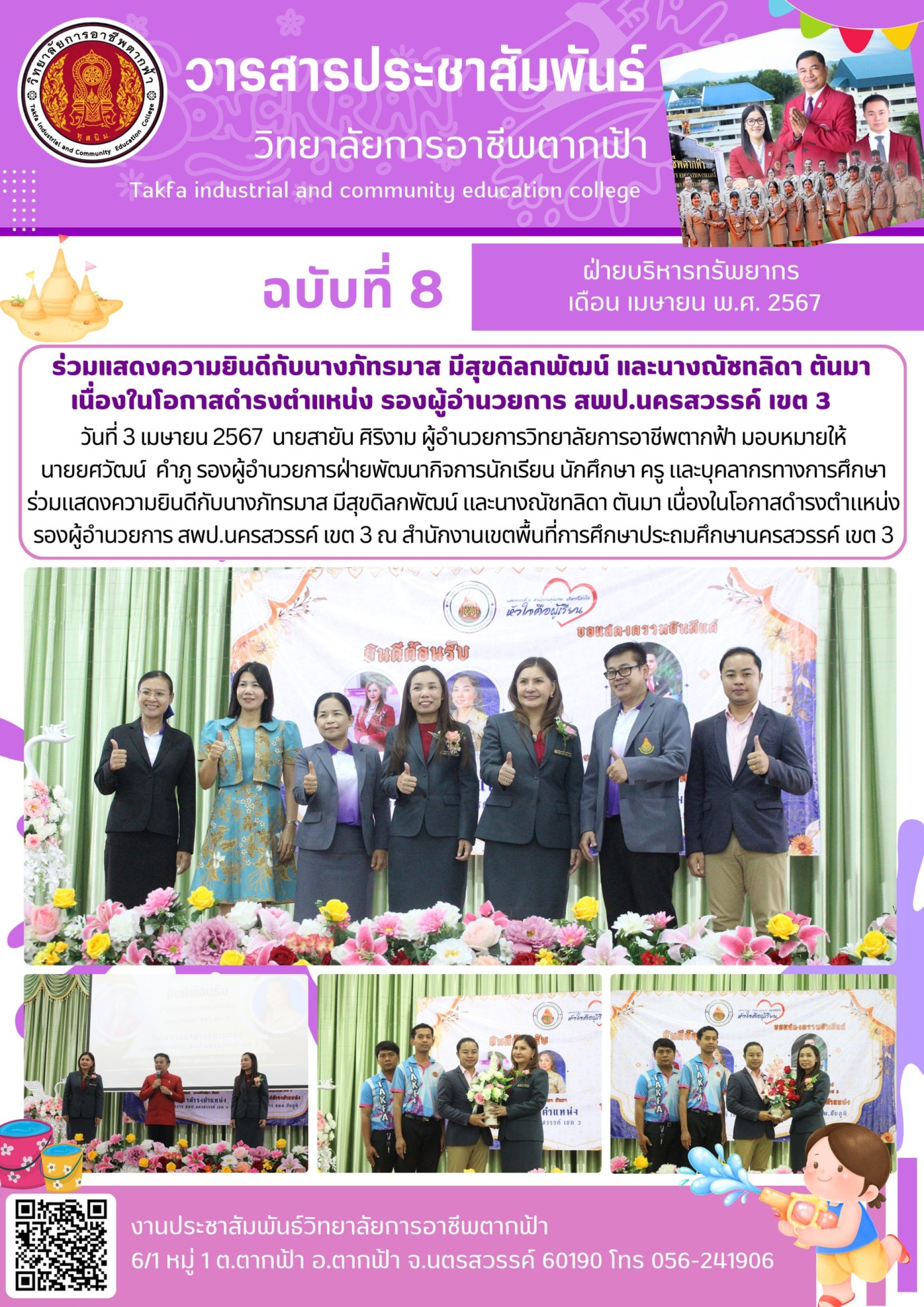 วารสารตากฟ้า ประจำเดือน เมษายน 2567 ฉบับที่ 8 ร่วมแสดงความยินดีกับนางภัทรมาส มีสุขดิลกพัฒน์ และนางณัชทลิดา ตันมา เนื่องในโอกาสดำรงตำแหน่ง รองผู้อำนวยการ สพป.นครสวรรค์ เขต 3