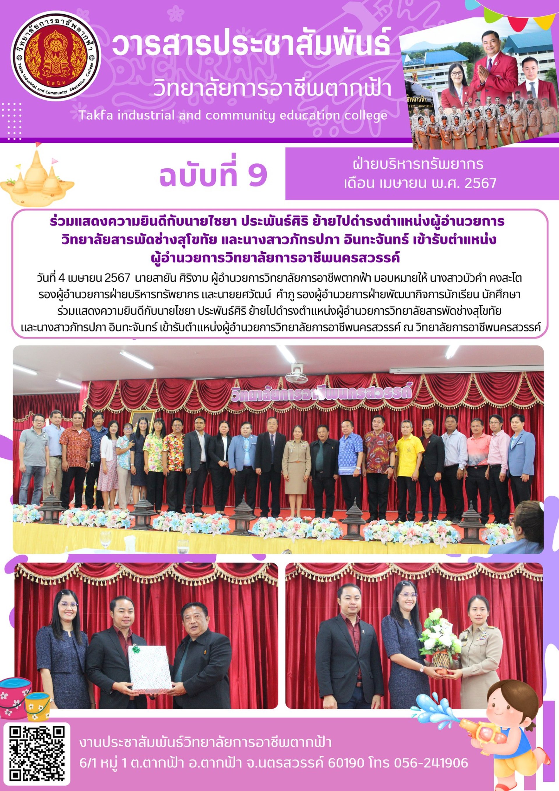 วารสารตากฟ้า ประจำเดือน เมษายน 2567 ฉบับที่ 9 ร่วมแสดงความยินดีกับนายไชยา ประพันธ์ศิริ ย้ายไปดำรงตำแหน่งผู้อำนวยการวิทยาลัยสารพัดช่างสุโขทัย และนางสาวภัทรปภา อินทะจันทร์ เข้ารับตำแหน่งผู้อำนวยการวิทยาลัยการอาชีพนครสวรรค์