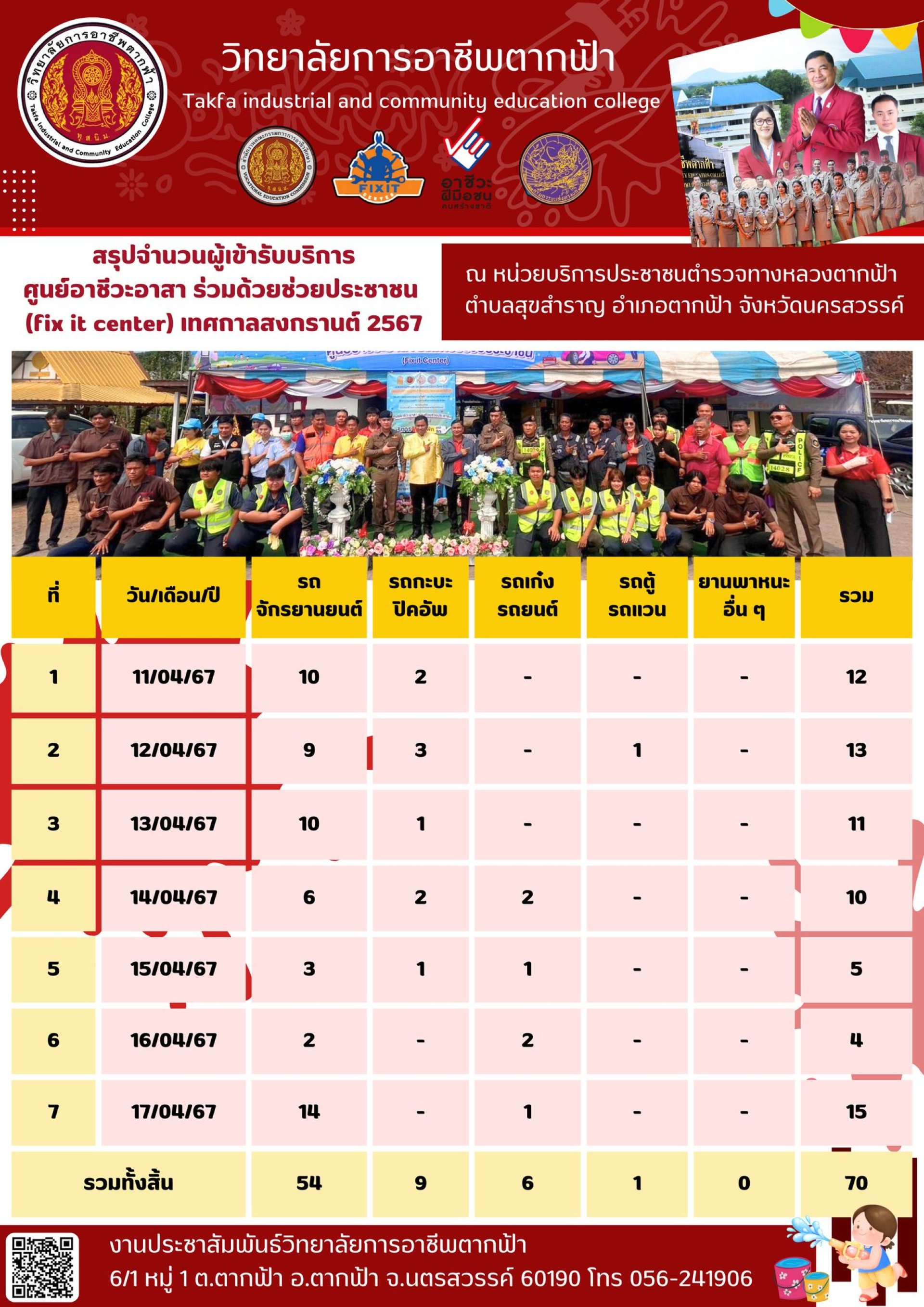 สรุปจำนวนผู้เข้ารับบริการศูนย์อาชีวะอาสา ร่วมด้วยช่วยประชาชน (fix it center) เทศกาลสงกรานต์ 2567 ณ หน่วยบริการประชาชนตำรวจทางหลวงตากฟ้า ตำบลสุขสำราญ อำเภอตากฟ้า จังหวัดนครสวรรค์ ตั้งแต่วันที่ 11 เมษายน ถึงวันที่ 17 เมษายน 2567