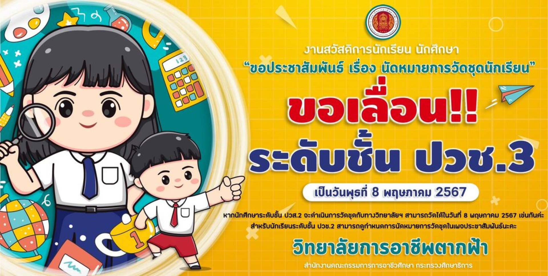 แจ้งขอเลื่อน!! งานสวัสดิการนักเรียน นักศึกษา "ขอประชาสัมพันธ์ เรื่อง นัดหมายการวัดชุดนักเรียนระดับชั้น ปวช.3 เท่านั้น **เป็นวันที่ 8 พฤษภาคม 2567** (หากนักศึกษาระดับชั้น ปวส.2 จะดำเนินการวัดชุดกับทางวิทยาลัยฯ สามารถวัดได้ในวันที่ 8 พฤษภาคม 2567 เช่น