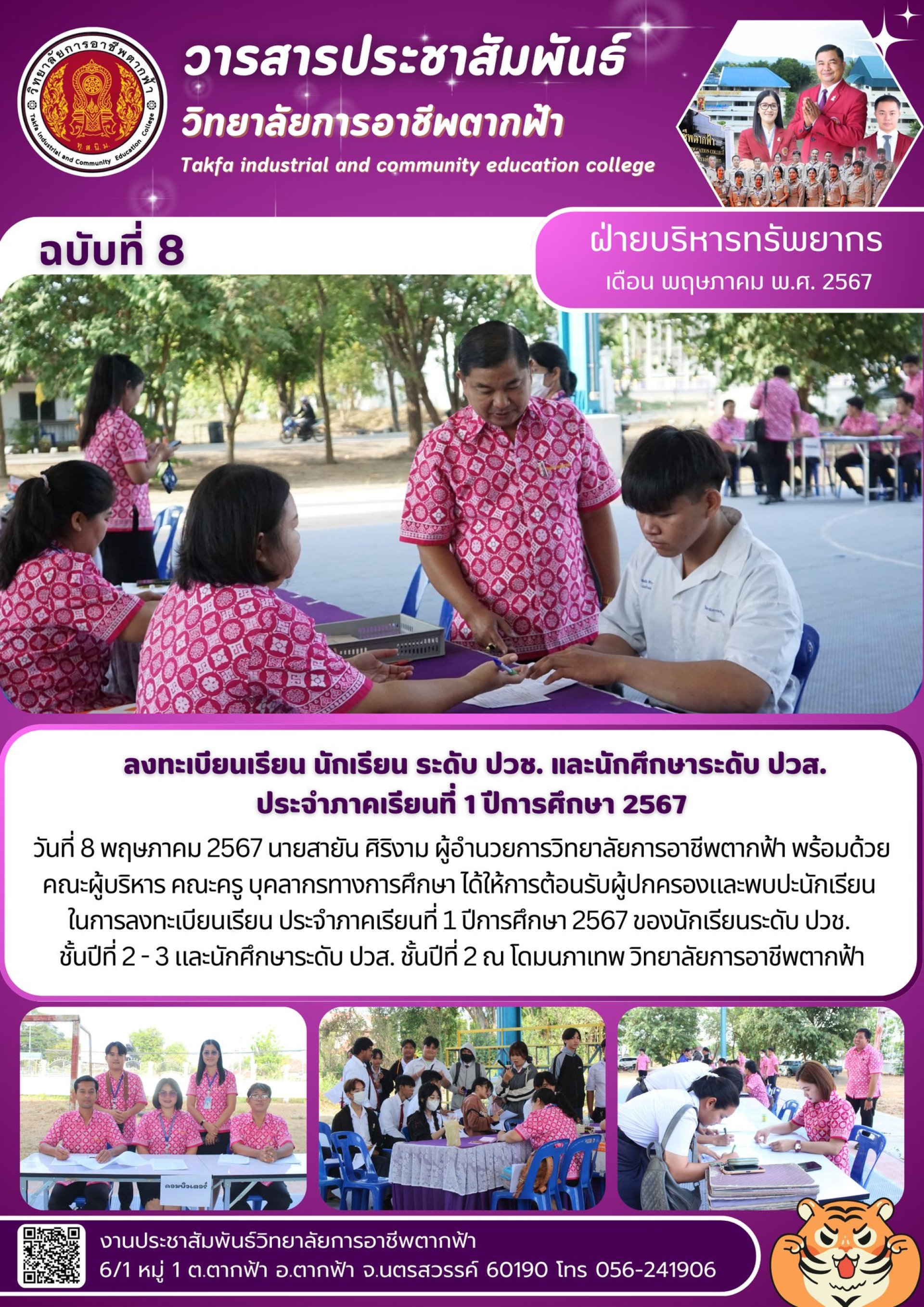 วารสารตากฟ้า ประจำเดือน พฤษภาคม 2567 ฉบับที่ 8 ลงทะเบียนเรียน นักเรียน ระดับ ปวช. และนักศึกษาระดับ ปวส. ประจำภาคเรียนที่ 1 ปีการศึกษา 2567