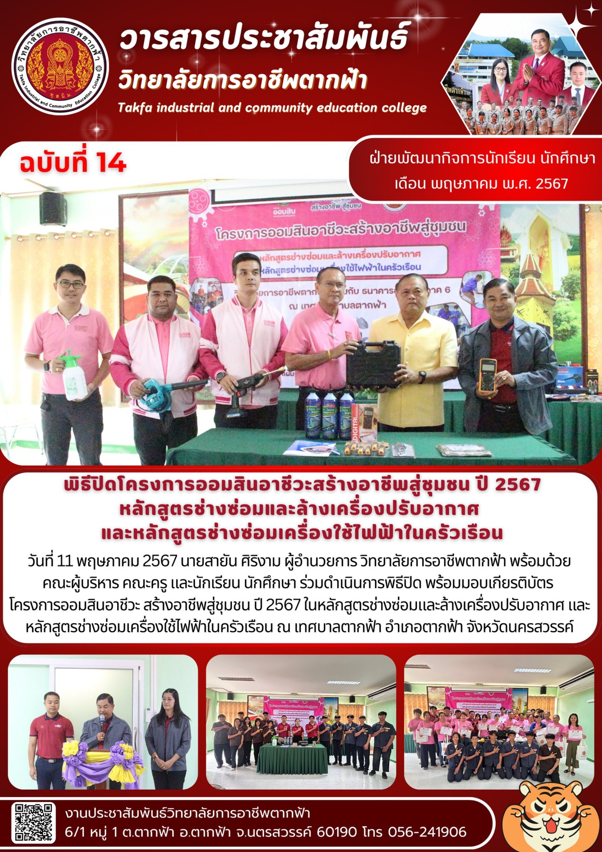 วารสารตากฟ้า ประจำเดือน พฤษภาคม 2567 ฉบับที่ 14 พิธีปิดโครงการออมสินอาชีวะสร้างอาชีพสู่ชุมชน ปี 2567 หลักสูตรช่างซ่อมและล้างเครื่องปรับอากาศ และหลักสูตรช่างซ่อมเครื่องใช้ไฟฟ้าในครัวเรือน