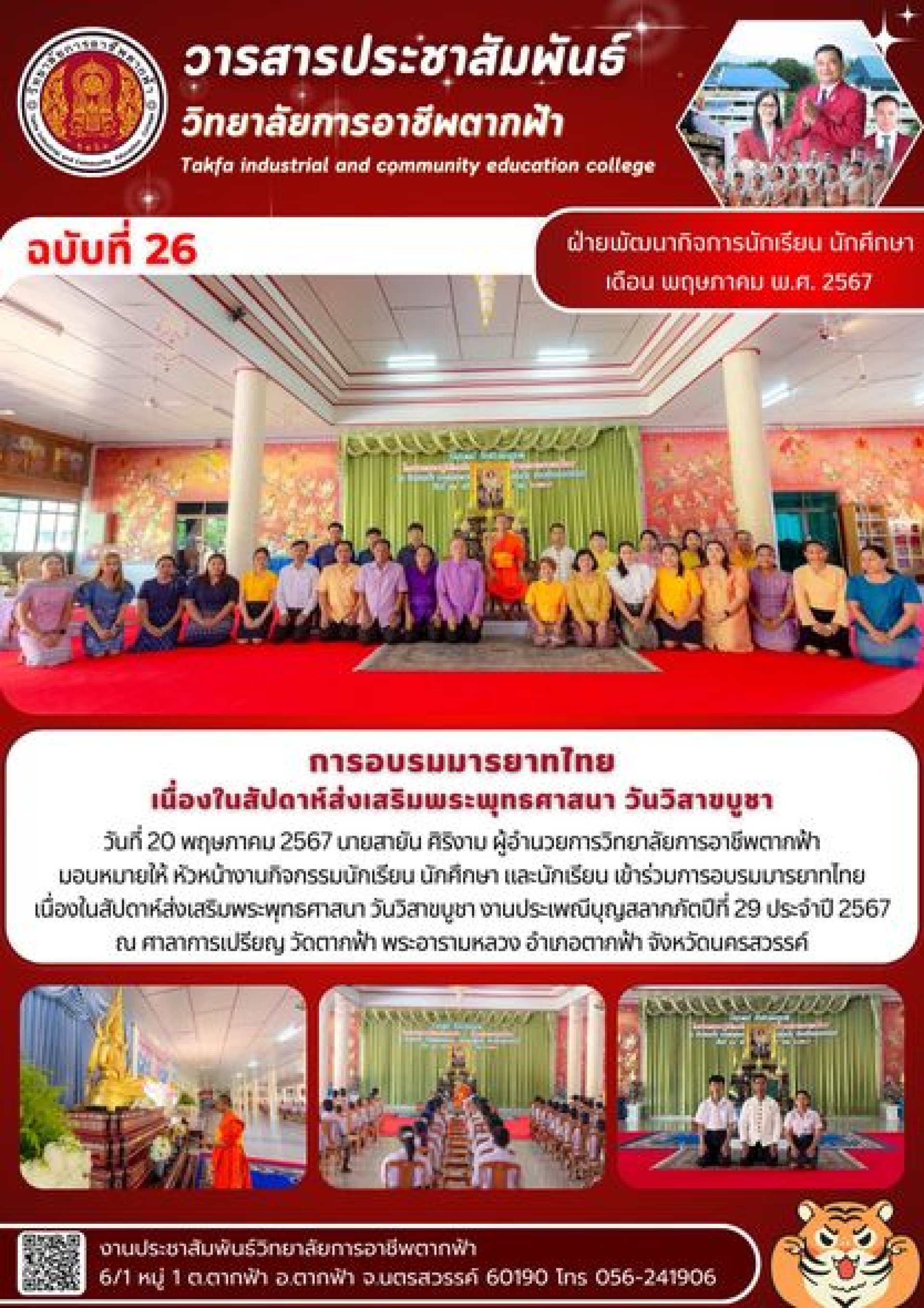 วันที่ 20 พฤษภาคม 2567 นายสายัน ศิริงาม ผู้อำนวยการวิทยาลัยการอาชีพตากฟ้า มอบหมายให้ หัวหน้างานกิจกรรมนักเรียน นักศึกษา และนักเรียน เข้าร่วมการอบรมมารยาทไทย เนื่องในสัปดาห์ส่งเสริมพระพุทธศาสนา วันวิสาขบูชา งานประเพณีบุญสลากภัตปีที่ 29 ประจำปี 2567 ณ ศาลาการเปรียญ วัดตากฟ้า พระอารามหลวง อำเภอตากฟ้า จังหวัดนครสวรรค์