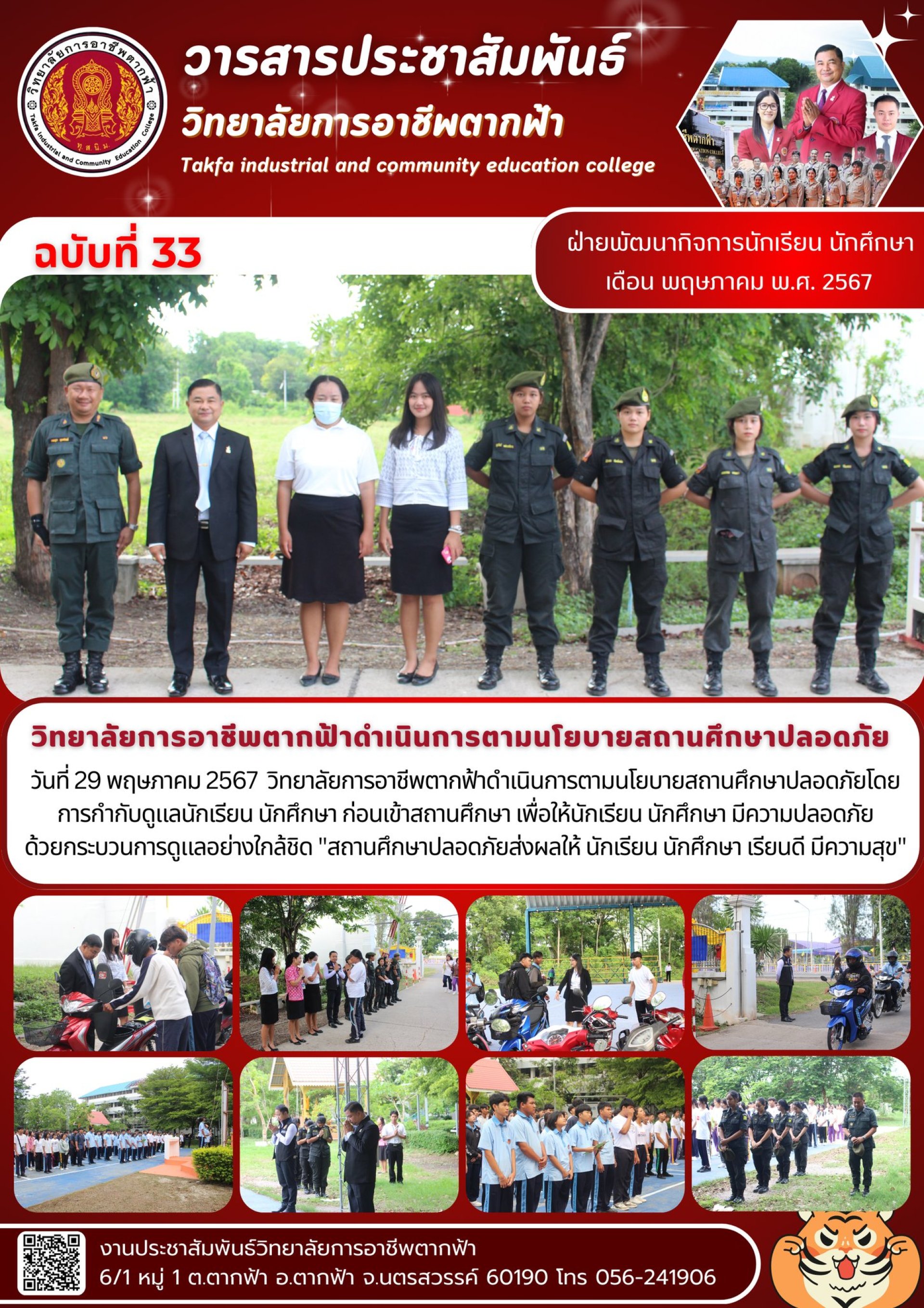 วารสารตากฟ้า ประจำเดือน พฤษภาคม 2567 ฉบับที่ 33 วิทยาลัยการอาชีพตากฟ้าดำเนินการตามนโยบายสถานศึกษาปลอดภัย