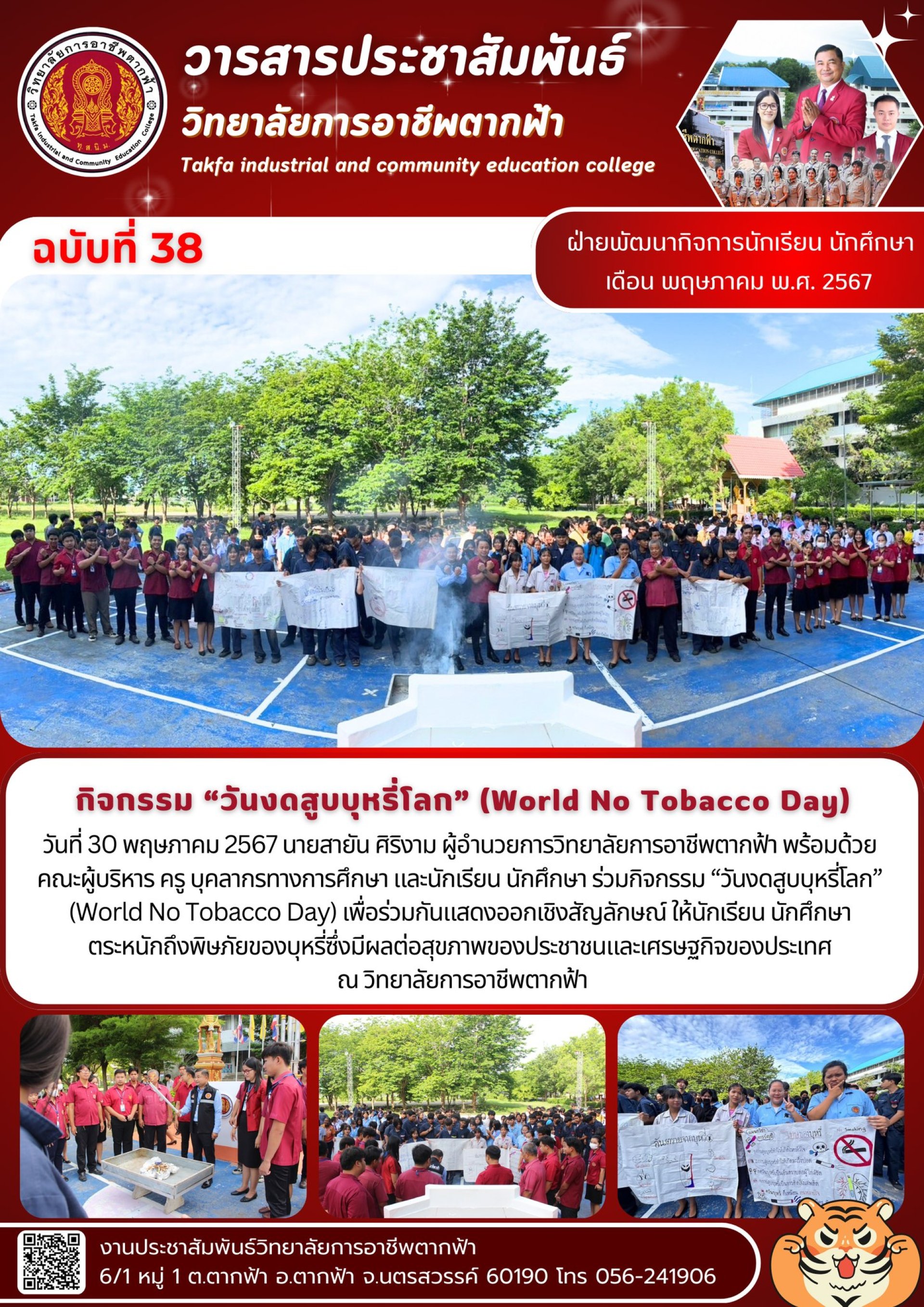 วันที่ 30 พฤษภาคม 2567 นายสายัน ศิริงาม ผู้อำนวยการวิทยาลัยการอาชีพตากฟ้า พร้อมด้วย คณะผู้บริหาร ครู บุคลากรทางการศึกษา และนักเรียน นักศึกษา ร่วมกิจกรรม วันงดสูบบุหรี่โลก (World No Tobacco Day) เพื่อร่วมกันแสดงออกเชิงสัญลักษณ์ ให้นักเรียน นักศึกษา ตระหนักถึงพิษภัยของบุหรี่ซึ่งมีผลต่อสุขภาพของประชาชนและเศรษฐกิจของประเทศ ณ วิทยาลัยการ