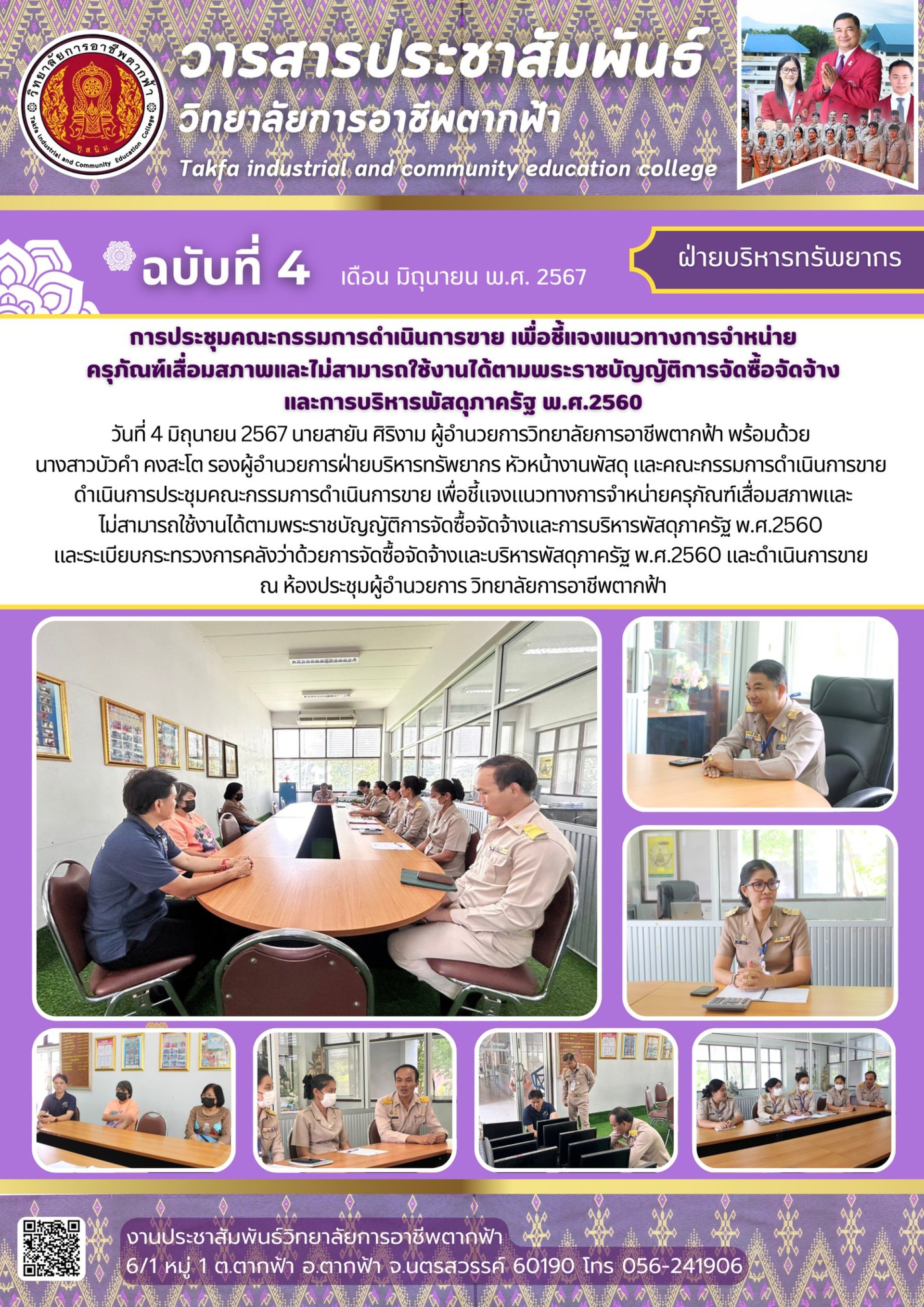 วันที่ 4 มิถุนายน 2567 นายสายัน ศิริงาม ผู้อำนวยการวิทยาลัยการอาชีพตากฟ้า พร้อมด้วย นางสาวบัวคำ คงสะโต รองผู้อำนวยการฝ่ายบริหารทรัพยากร หัวหน้างานพัสดุ และคณะกรรมการดำเนินการขาย ดำเนินการประชุมคณะกรรมการดำเนินการขาย เพื่อชี้แจงแนวทางการจำหน่ายครุภัณฑ์เสื่อมสภาพและไม่สามารถใช้งานได้ตามพระราชบัญญัติการจัดซื้อจัดจ้างและการบริหารพัสดุภาครัฐ พ.ศ.2560 และระเบียบกระทรวงการคลังว่าด้วยการจัดซื้อจัดจ้างและบริหารพัสดุภาครัฐ พ.ศ.2560 และดำเนินการขาย ณ ห้องประชุมผู้อำนวยการ วิทยาลัยการอาชีพตากฟ้า