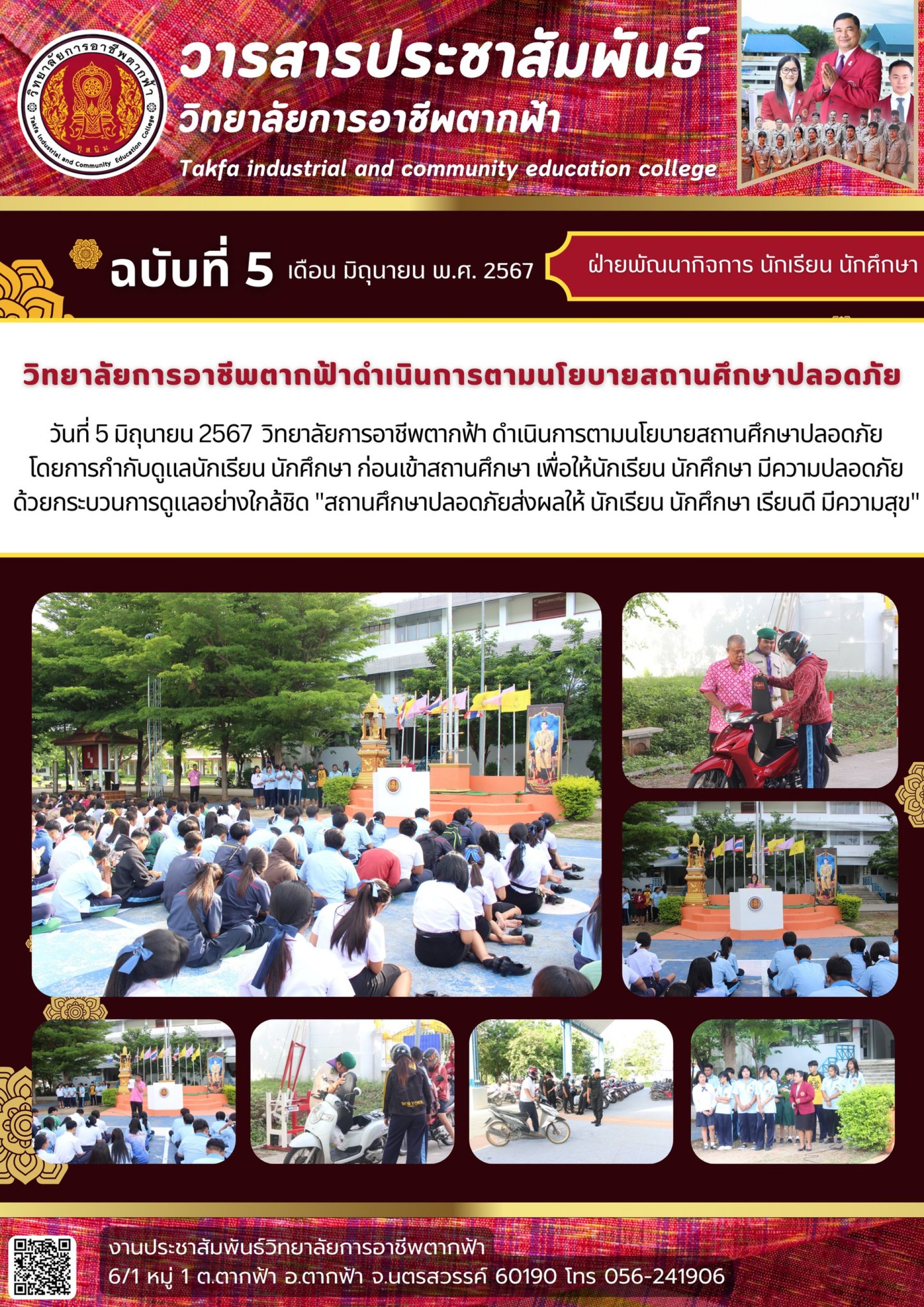 วารสารตากฟ้า ประจำเดือน มิถุนายน 2567 ฉบับที่ 5 วิทยาลัยการอาชีพตากฟ้าดำเนินการตามนโยบายสถานศึกษาปลอดภัย