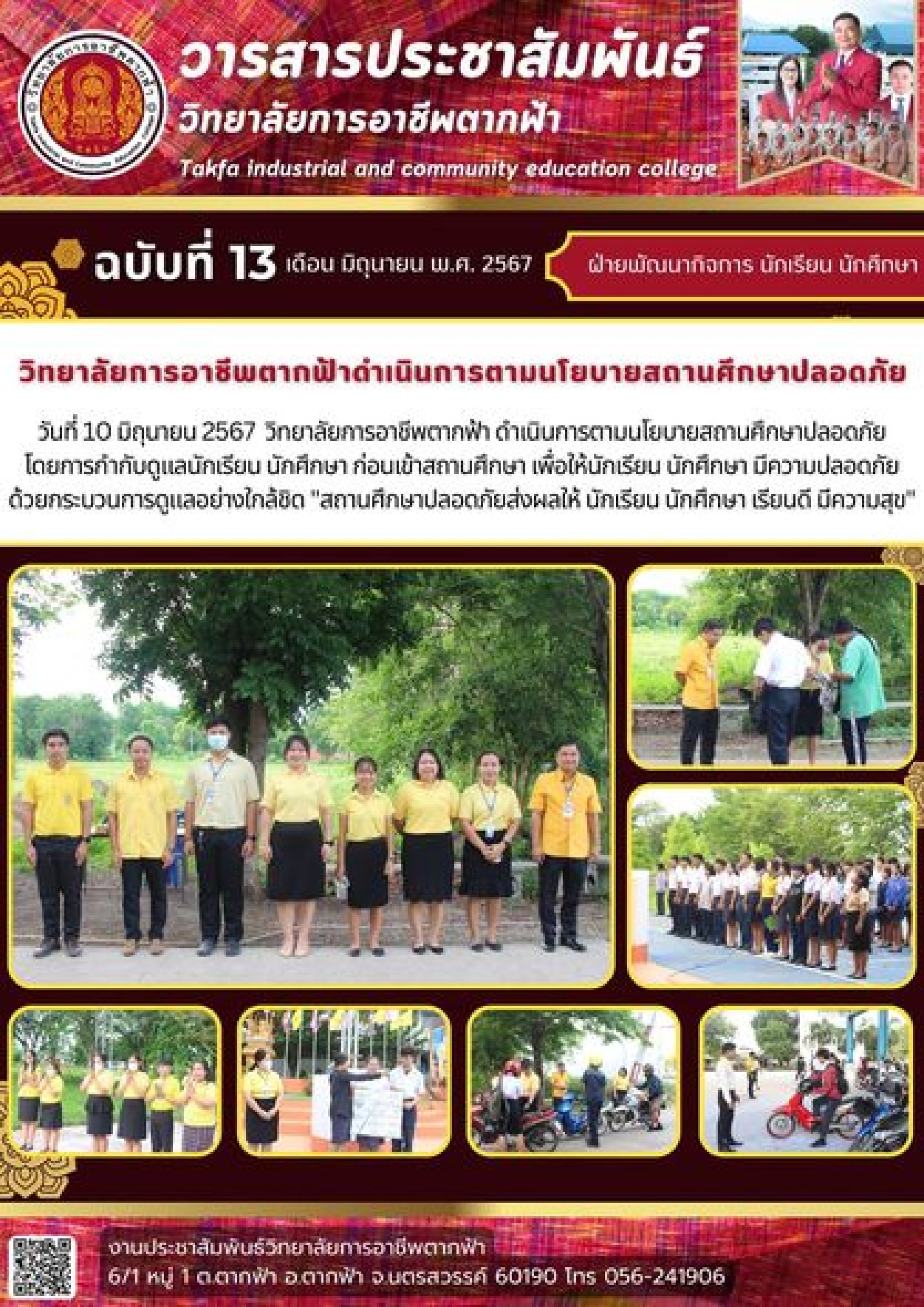 วารสารตากฟ้า ประจำเดือน มิถุนายน 2567 ฉบับที่ 13 วิทยาลัยการอาชีพตากฟ้าดำเนินการตามนโยบายสถานศึกษาปลอดภัย