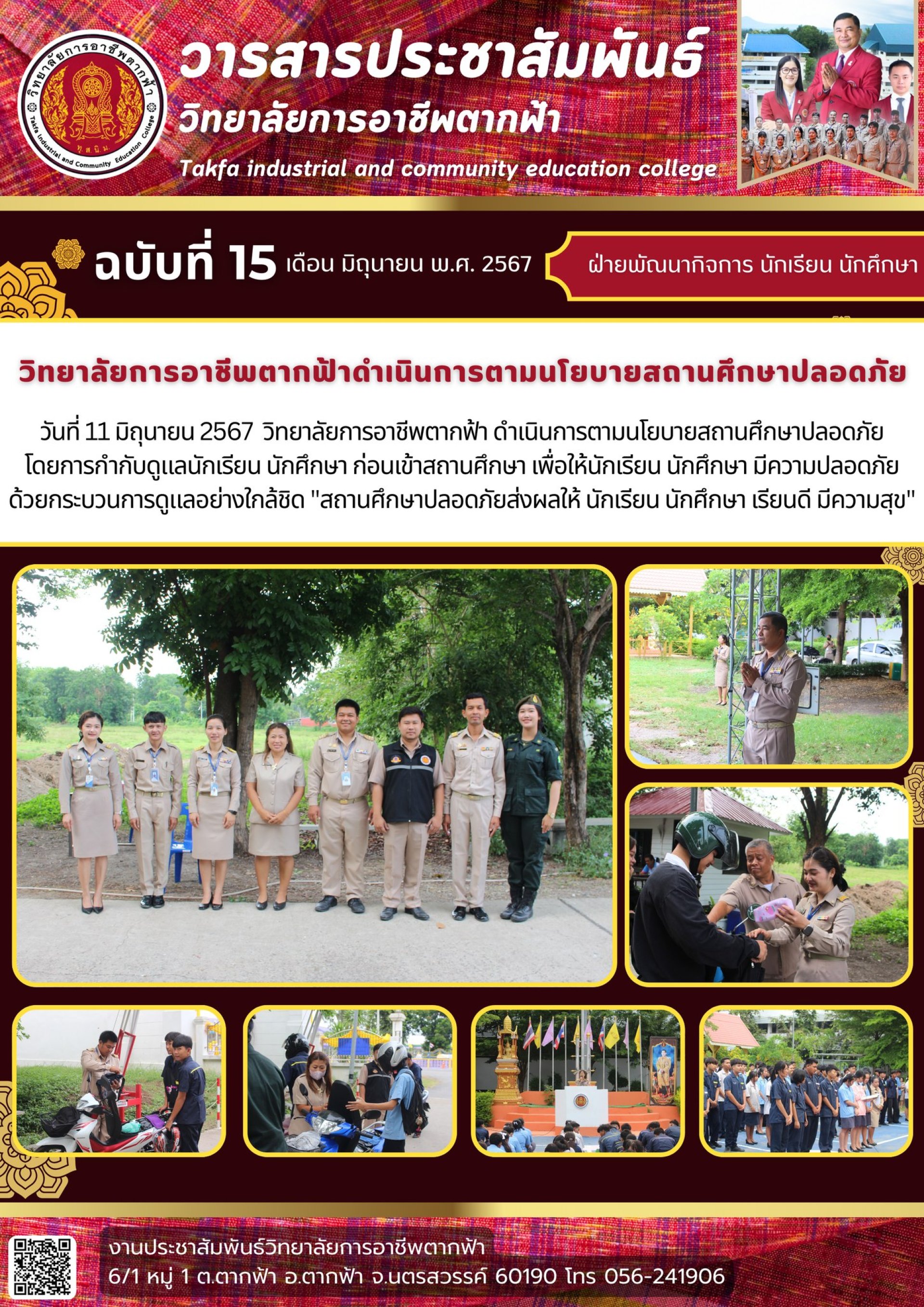 วารสารตากฟ้า ประจำเดือน มิถุนายน 2567 ฉบับที่ 15 วิทยาลัยการอาชีพตากฟ้าดำเนินการตามนโยบายสถานศึกษาปลอดภัย